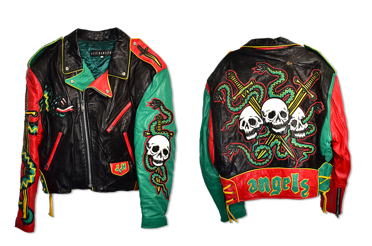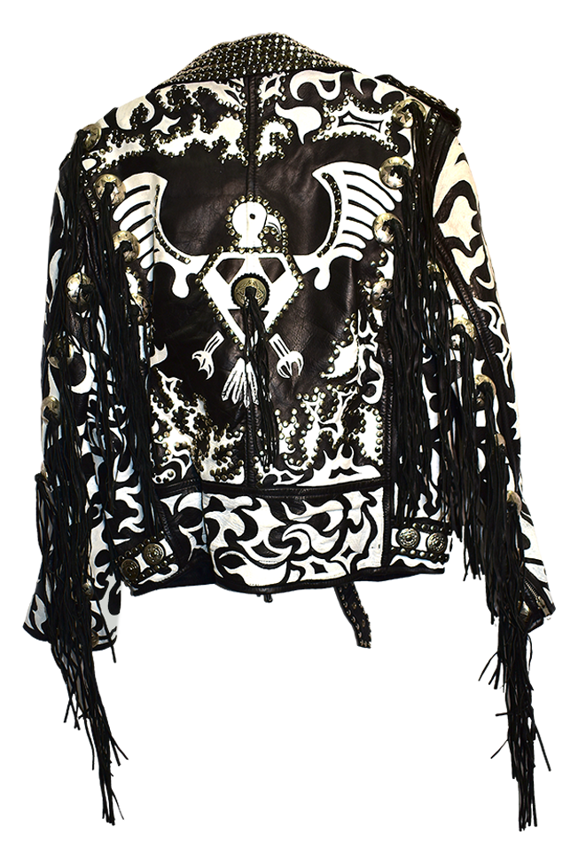 This lush, painted leather jacket was pulled straight from the Def Leppard wardrobe. The designer is the iconic rock fashion label Red Balls On Fire, which had the coolest shops on Melrose in LA, and Kensington in London. It's a perfectly tailored jacket with fringe, studs, and they put a bird on it. From the collection of Joe Elliott.