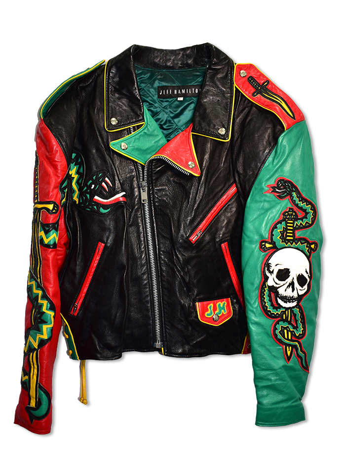 Just lay your eyes on this striking skulls 'n snakes leather jacket straight from Joe Elliott's personal Def Leppard wardrobe. Joe can be seen wearing this green satin-lined, Jeff Hamilton-designed jacket in the series of 1992 promotional shots for Adrenalize. As evidenced in those snaps, this jacket pairs nicely with snakeskin boots. From the collection of Joe Elliott.