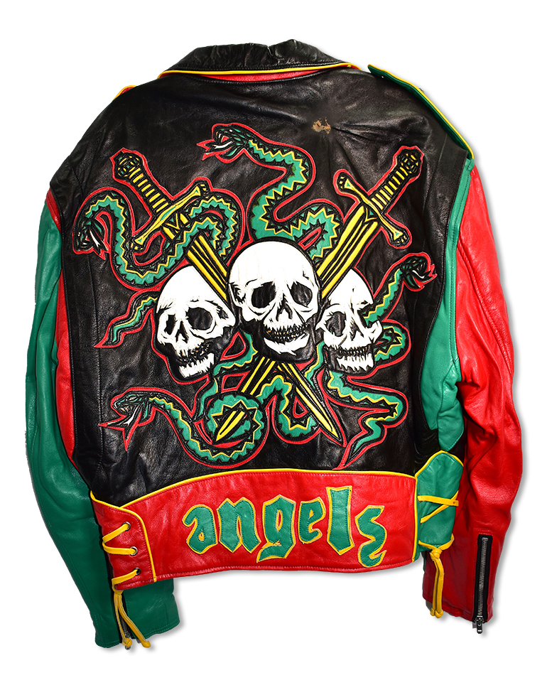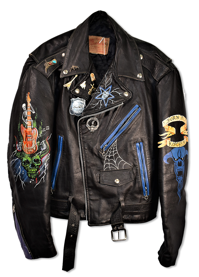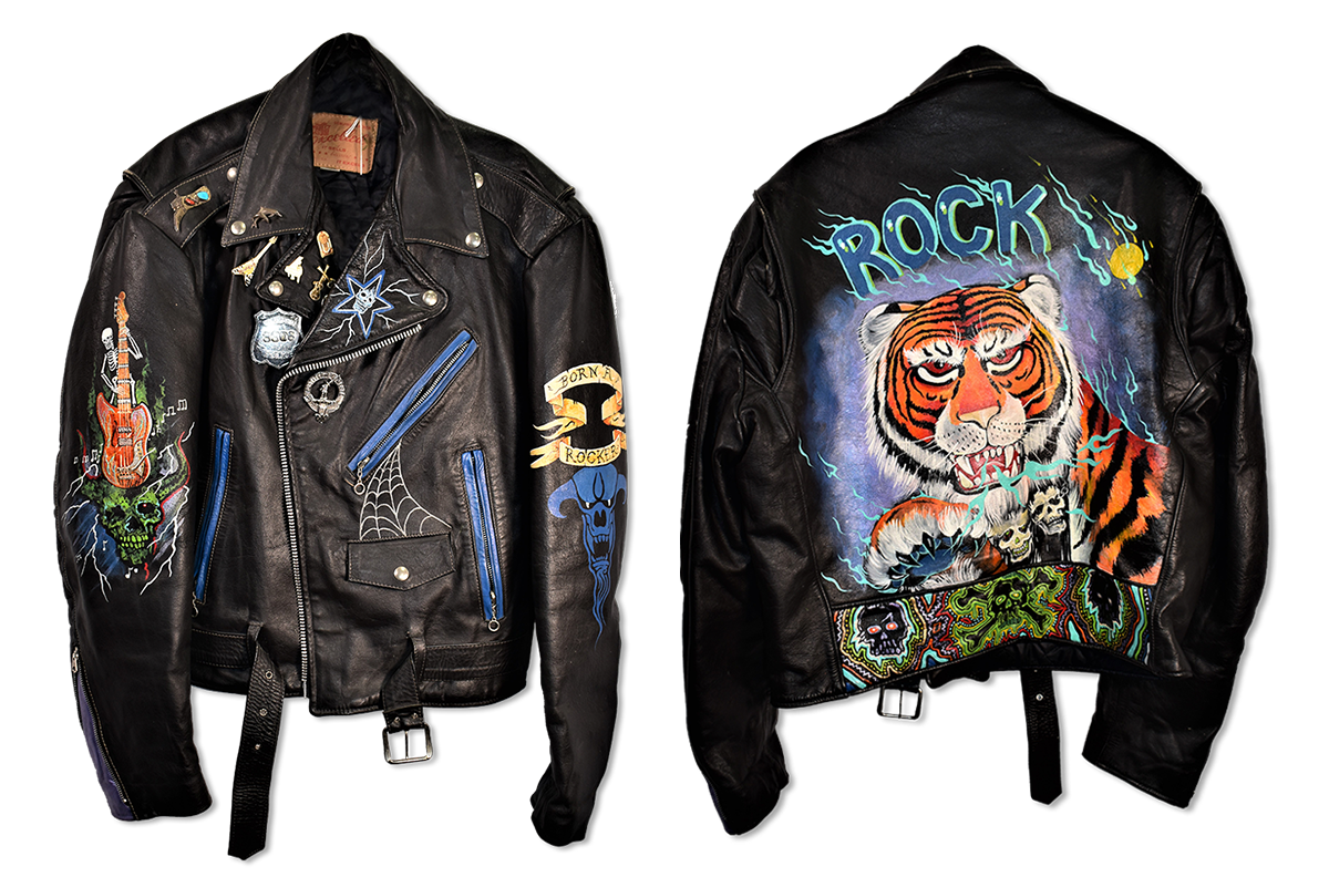 Rocket! Yeah! Jacket of Love! Joe Elliott's hand-painted black leather biker jacket worn in the Rocket video. By the brand Excelled, complete with Rock Tiger adorning the back, and "Born a Rocker" demon skull on the left sleeve. In a nice touch, a metal badge with the Elliott family crest lives over the heart, as well as various pins and painted embellishments. Plus, check out the blue painted zip pockets. A jacket to destroy all other jackets. From the collection of Joe Elliott.