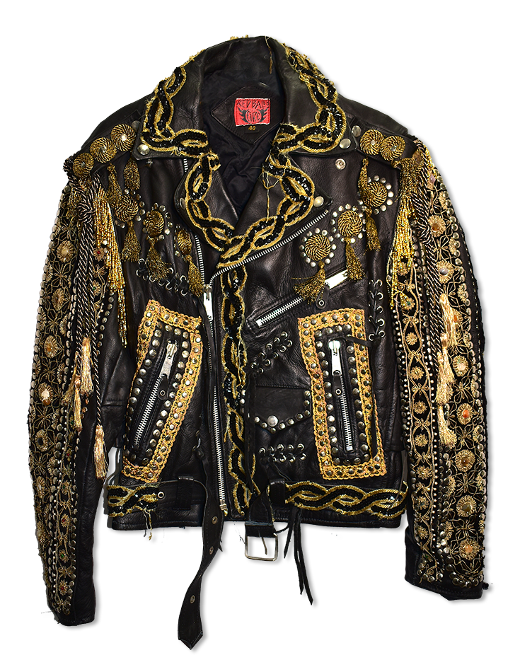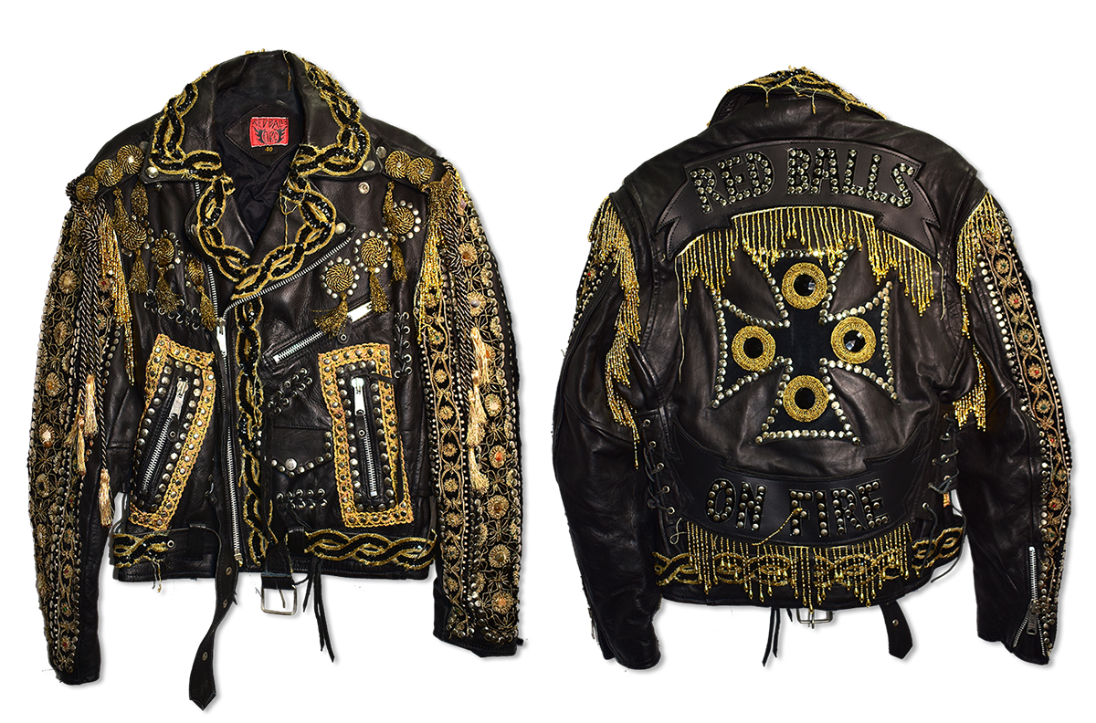 A rock star all on its own, this gussied up black leather jacket was made by Red Balls On Fire, which was originally established in 1985 Kensington Market, London. With gold upholstery accents, gems, studs, and a large iron cross design on the back this jacket is ready to hit the stage again. From the collection of Joe Elliott.