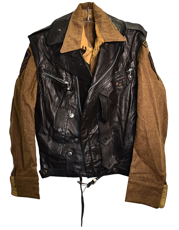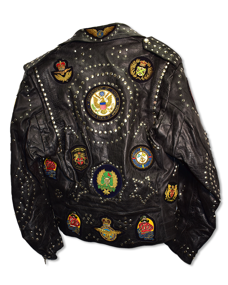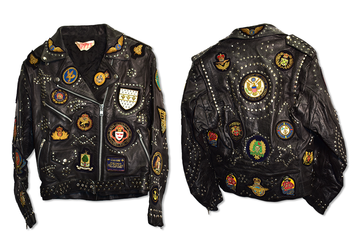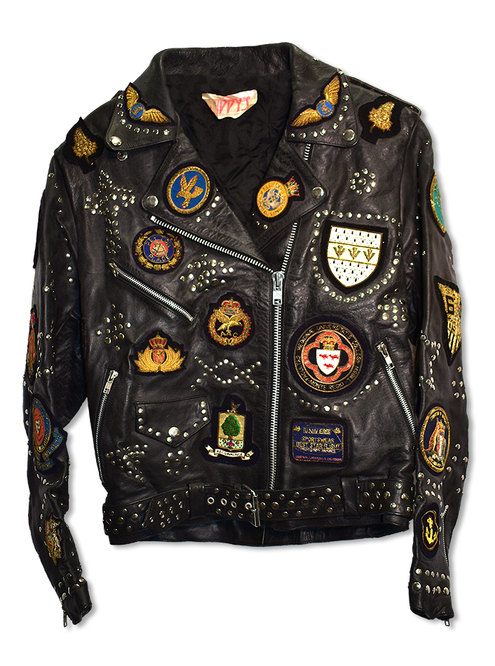 A rockin' black leather jacket with studs and insignia patches galore, including the Salvation Army and Royal Marines. Made by Pippy. From the collection of Joe Elliott.