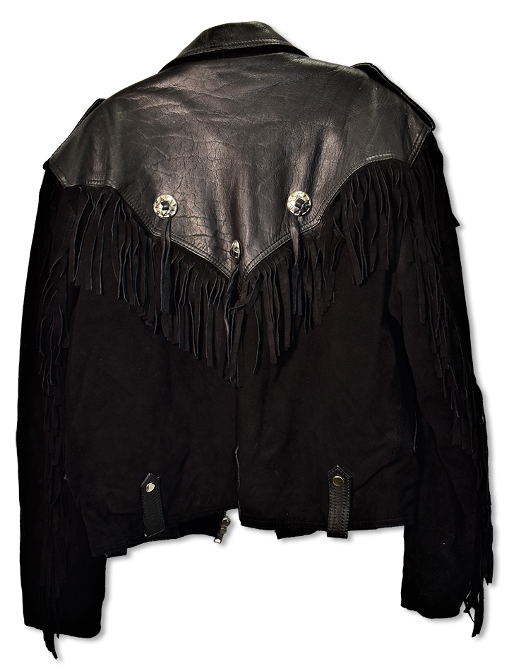 Made by Nice London, this is a black fringe suede leather jacket with 2 star accents buttons on front, and 3 star accent buttons on back. From the collection of Joe Elliott.