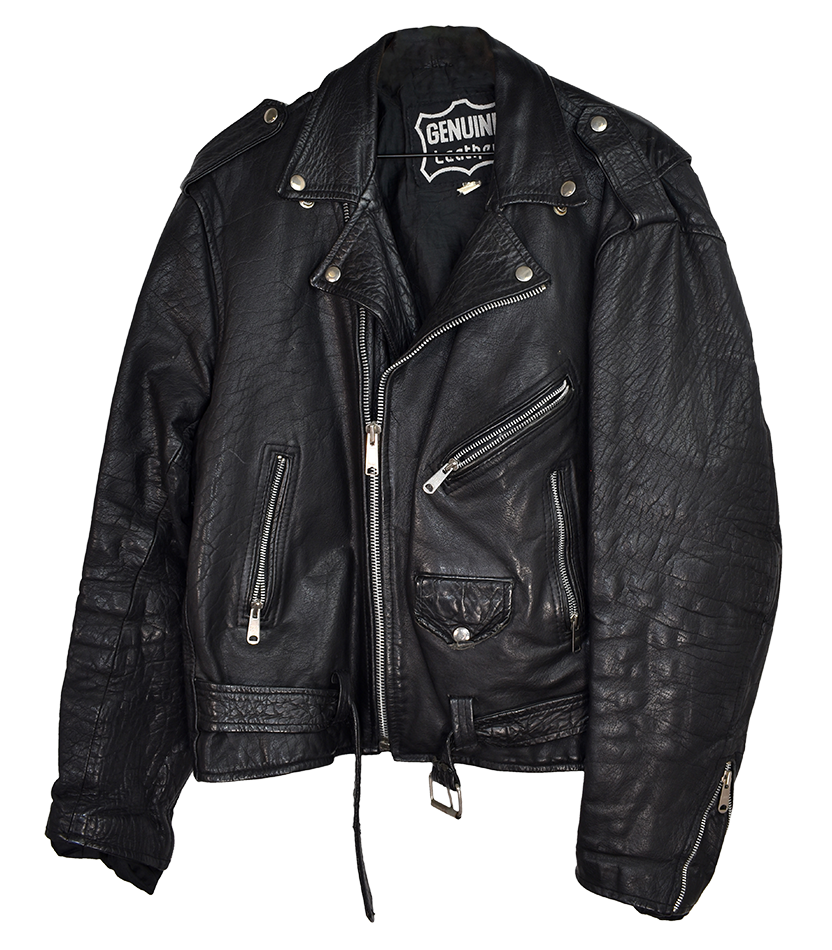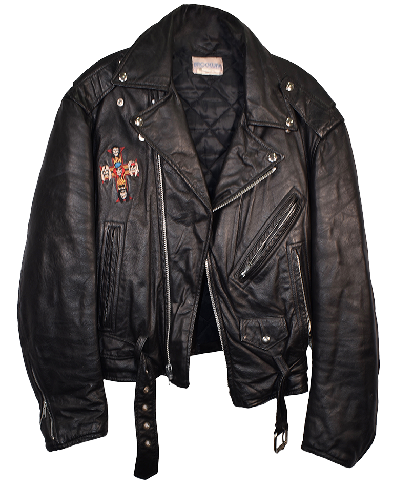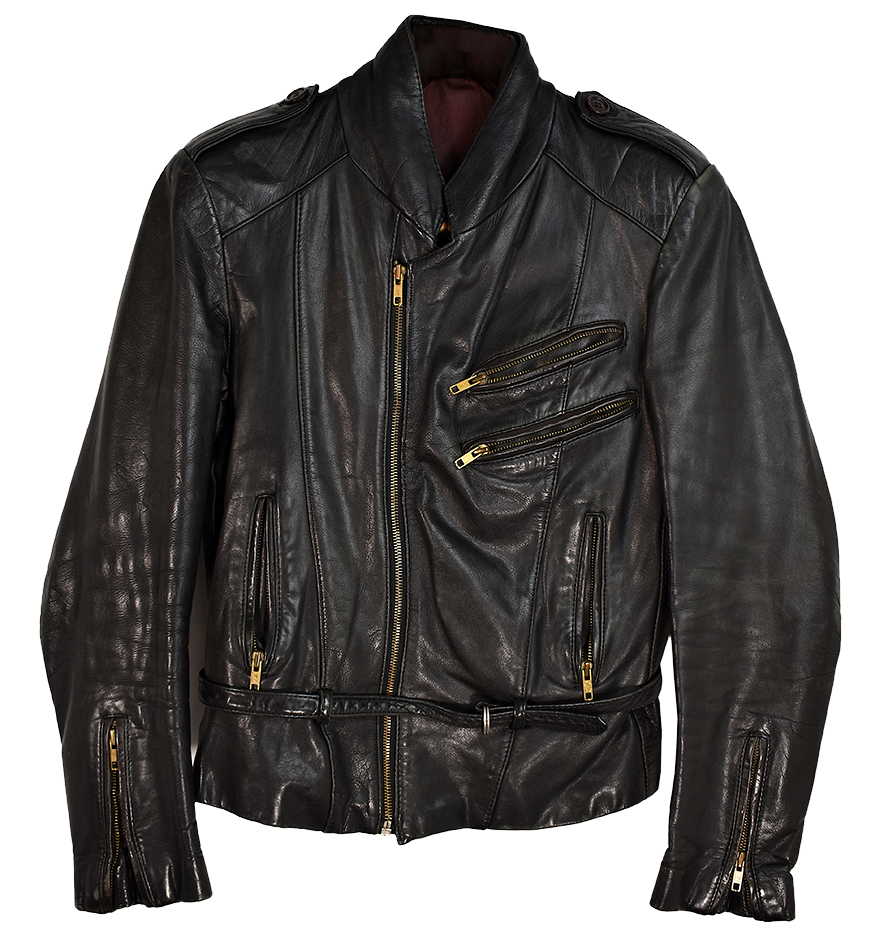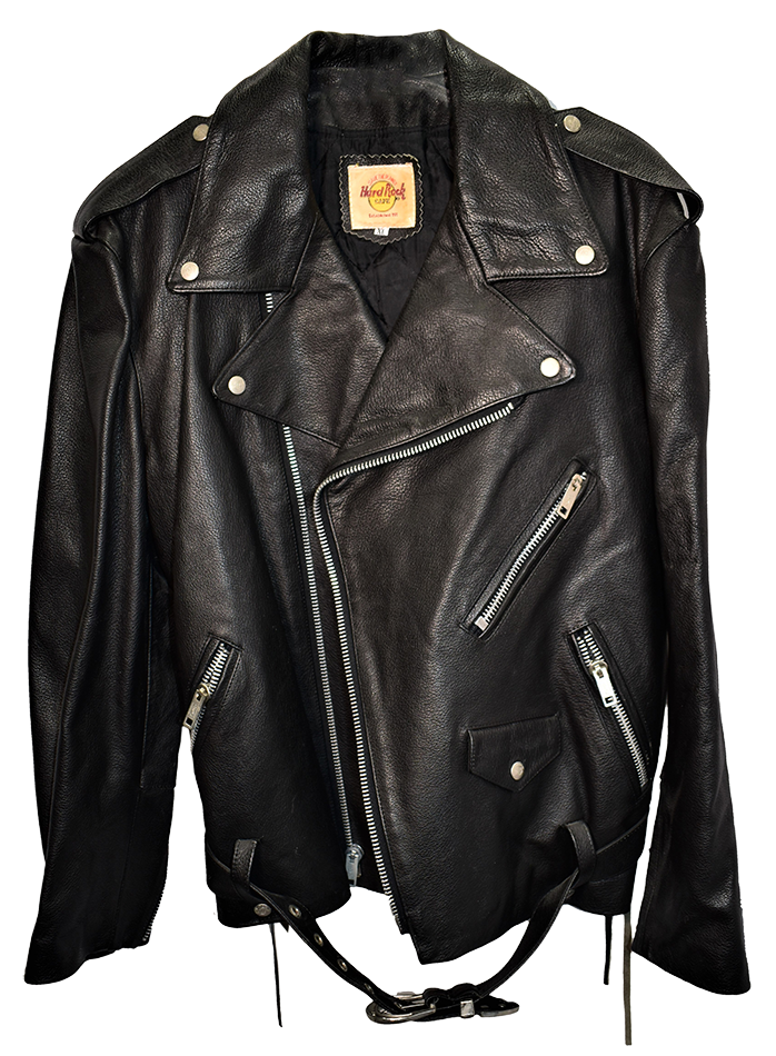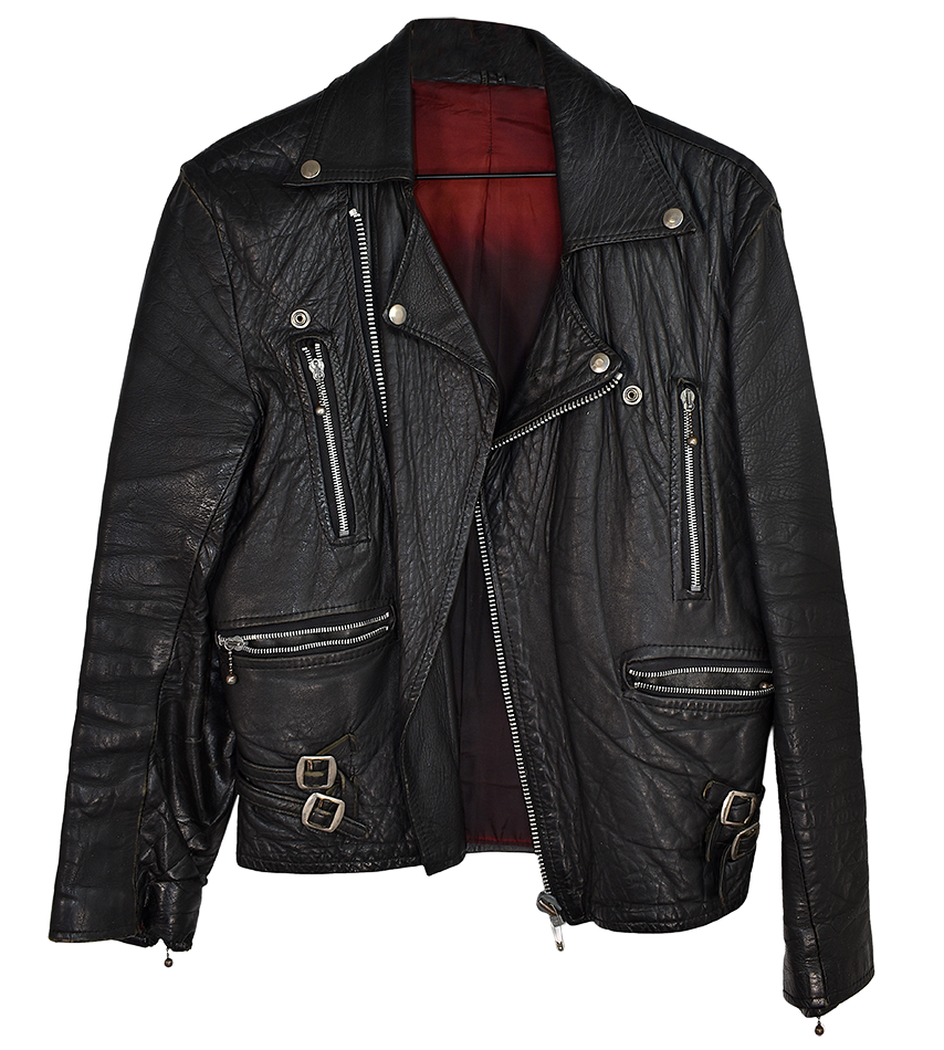 Steve Clark's very own black leather motorcycle jacket with zip up cuffs, zip up pockets, and buckled waist. Leather perfectly distressed from wear. For a personal touch, note the small safety pin hooked onto the zipper, where the pull tab has come off, most likely from excessive use. Courtesy of the Lorelei Shellist Private Collection.