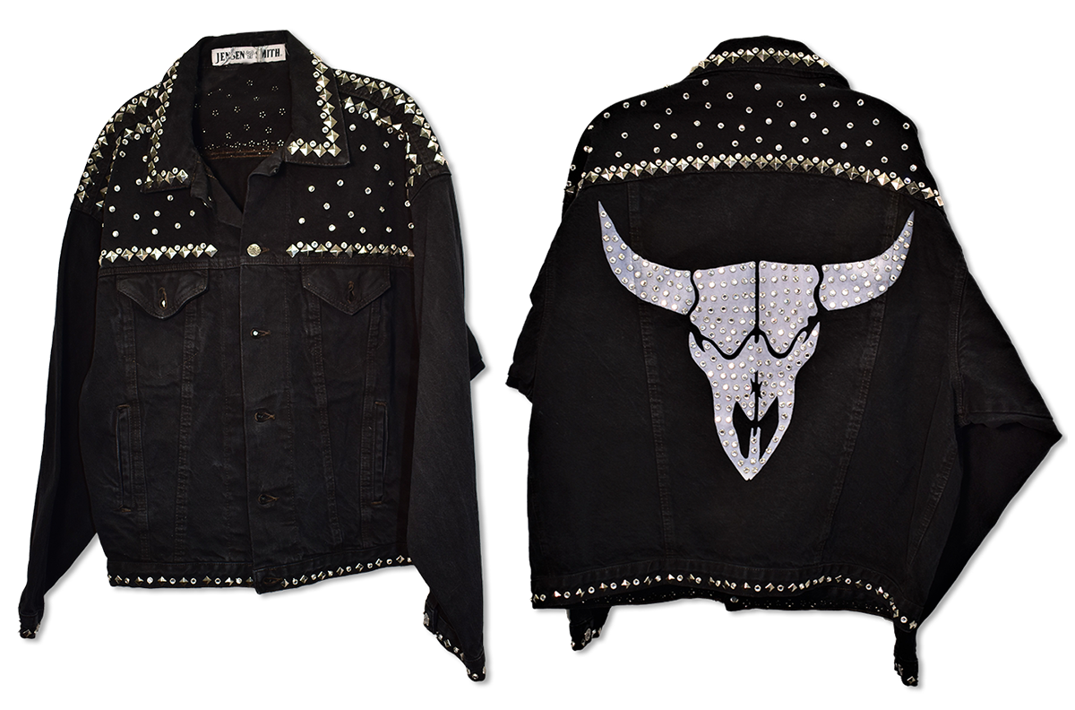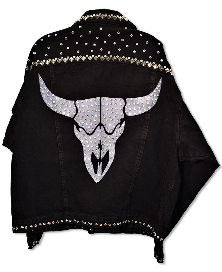 A black denim jacket with decorative studs and rhinestone accents on the collars and shoulders. A white rhinestone adorned cow skull is on back. From the collection of Joe Elliott.