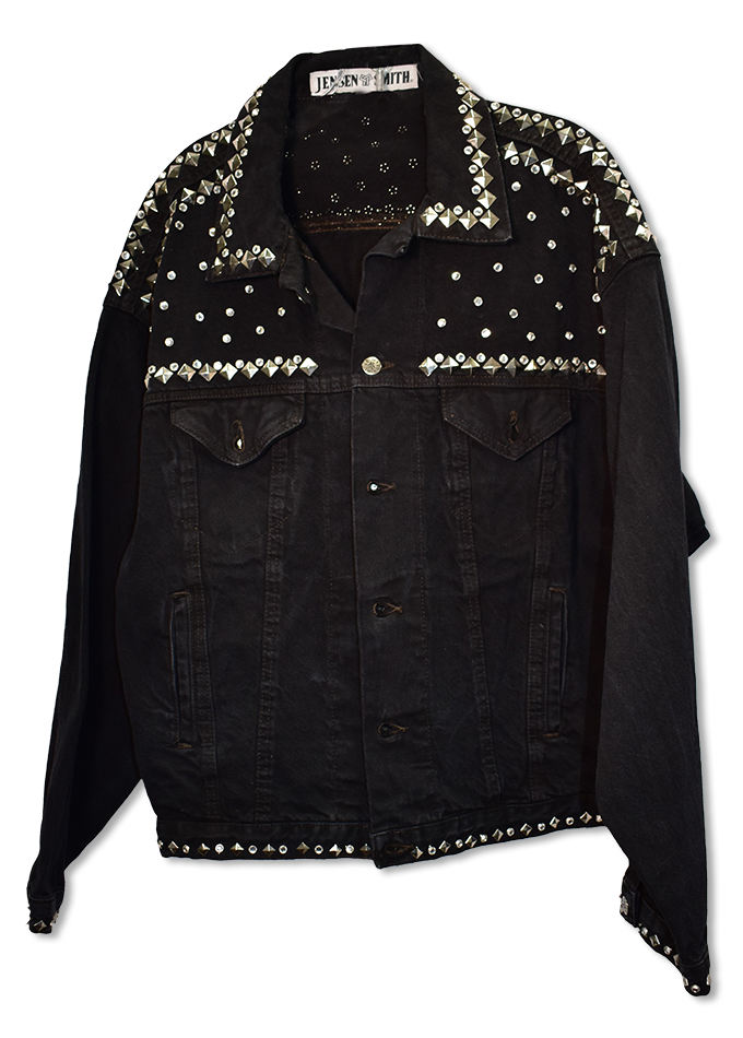 A black denim jacket with decorative studs and rhinestone accents on the collars and shoulders. A white rhinestone adorned cow skull is on back. Purchased and worn in 2005. From the collection of Joe Elliott.