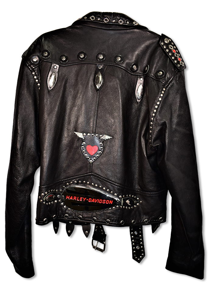 This black-leather, Kim Hadleigh jacket has a studded lapel, a winged heart insignia below the front pocket, and red gem and hexagon studs on the shoulders. On the back you'll find a large reflective Harley Davidson insignia, and a small leather patch with a heart. From the collection of Joe Elliott.