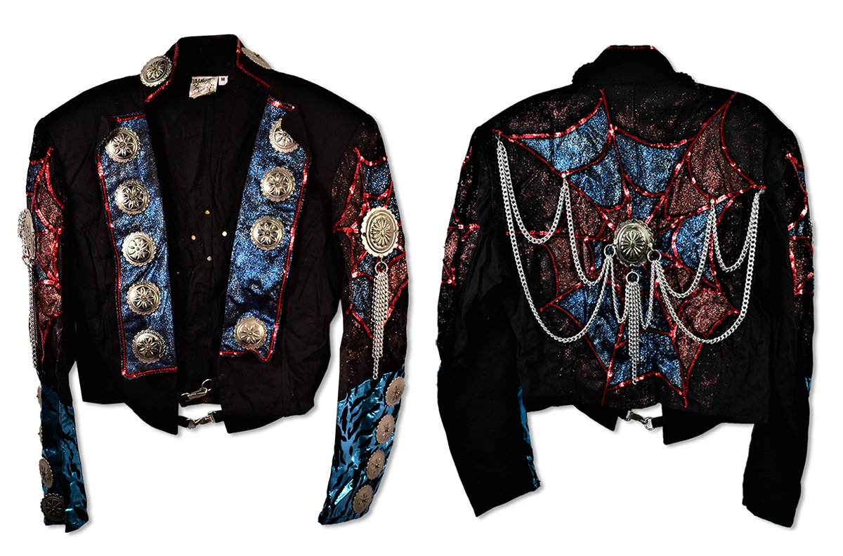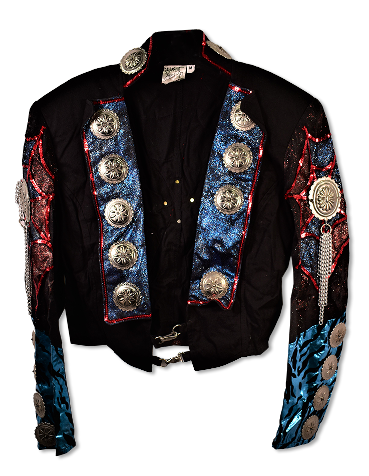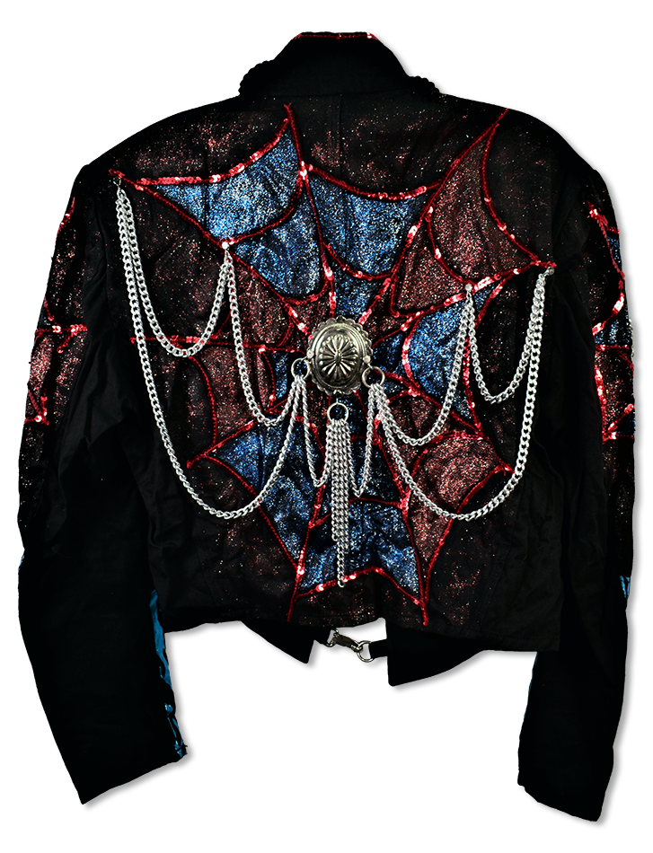 This is one sexy matador jacket. This Kristi Smart design features blue and red glitter, red sequins, metal floral accents, and metal chains on top of spider web designs. On the back you'll find more of the same all within a large sequined spider web. The front closes with hooks. From the collection of Joe Elliott.