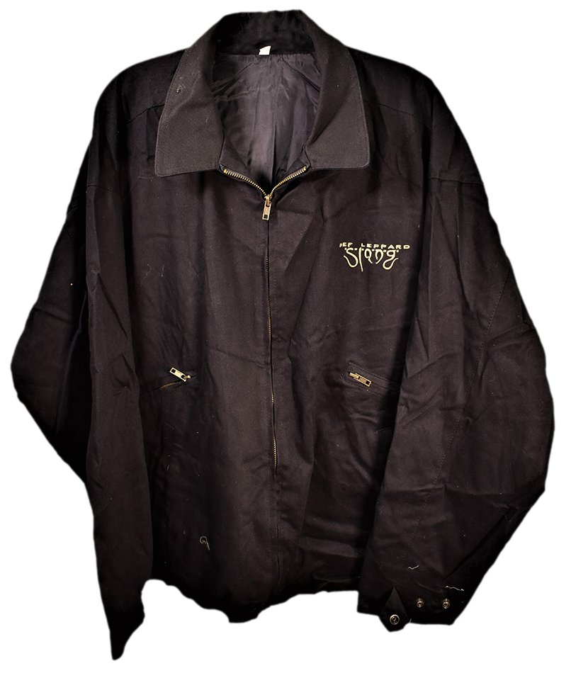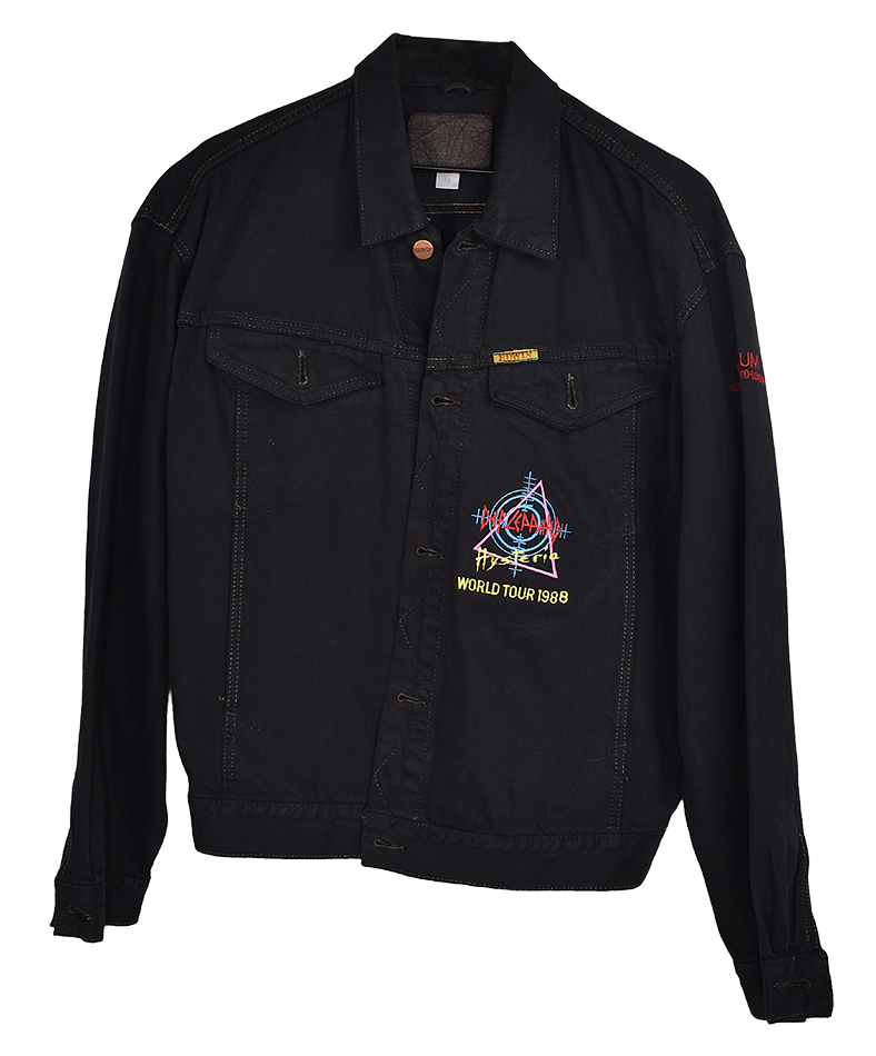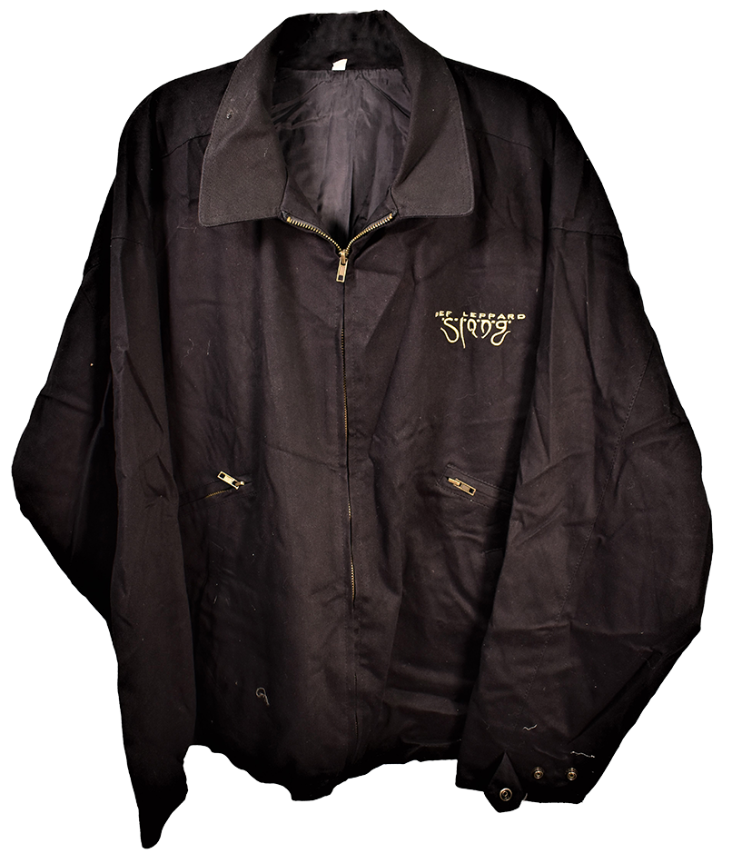 Steve Clark's black denim Hysteria tour jacket with branded buttons and embroidered "Def Leppard Hysteria World Tour 1988" below the front pocket. "Brockum New York Toronto London" emblazoned on the sleeve. This jacket was sturdy enough to withstand the massive globe-covering tour, and cool enough to be a Clark-covering garment. Good condition. Courtesy of the Lorelei Shellist Private Collection.