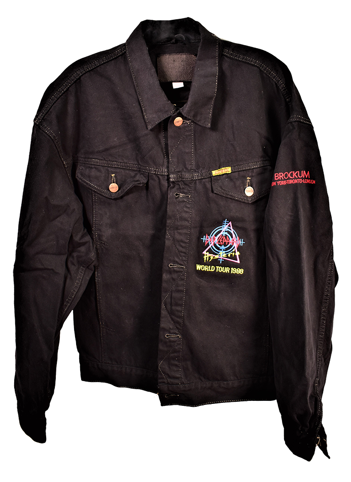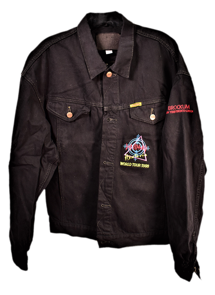 A black denim jacket with a red embroidered "Brockum New York-Toronto-London" on the left sleeve, and "Def Leppard Hysteria World Tour 1988" embroidered on front. From the collection of Joe Elliott.