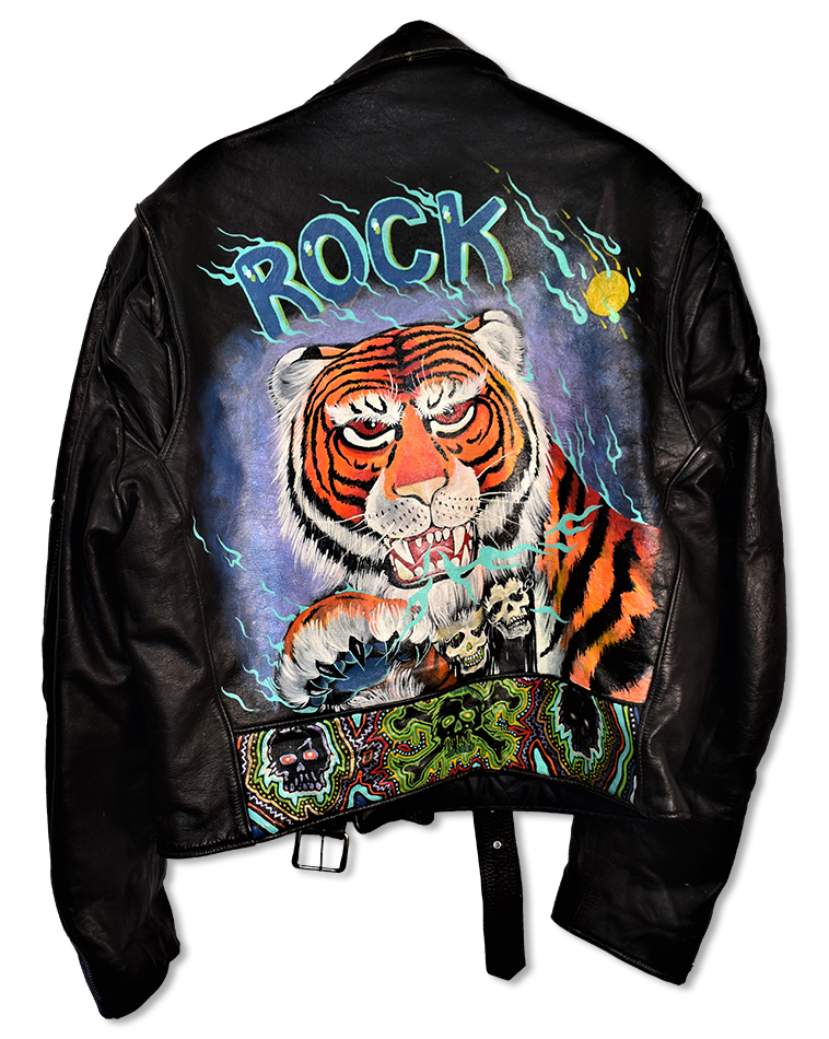 Joe Elliott's hand-painted black leather biker jacket from Excelled, complete with Rock Tiger adorning the back, and "Born a Rocker" demon skull on the left sleeve. In a nice touch, a metal badge with the Elliott family crest lives over the heart, as well as various pins and painted embellishments. And check out the blue painted zip pockets. A jacket to destroy all other jackets. From the collection of Joe Elliott.