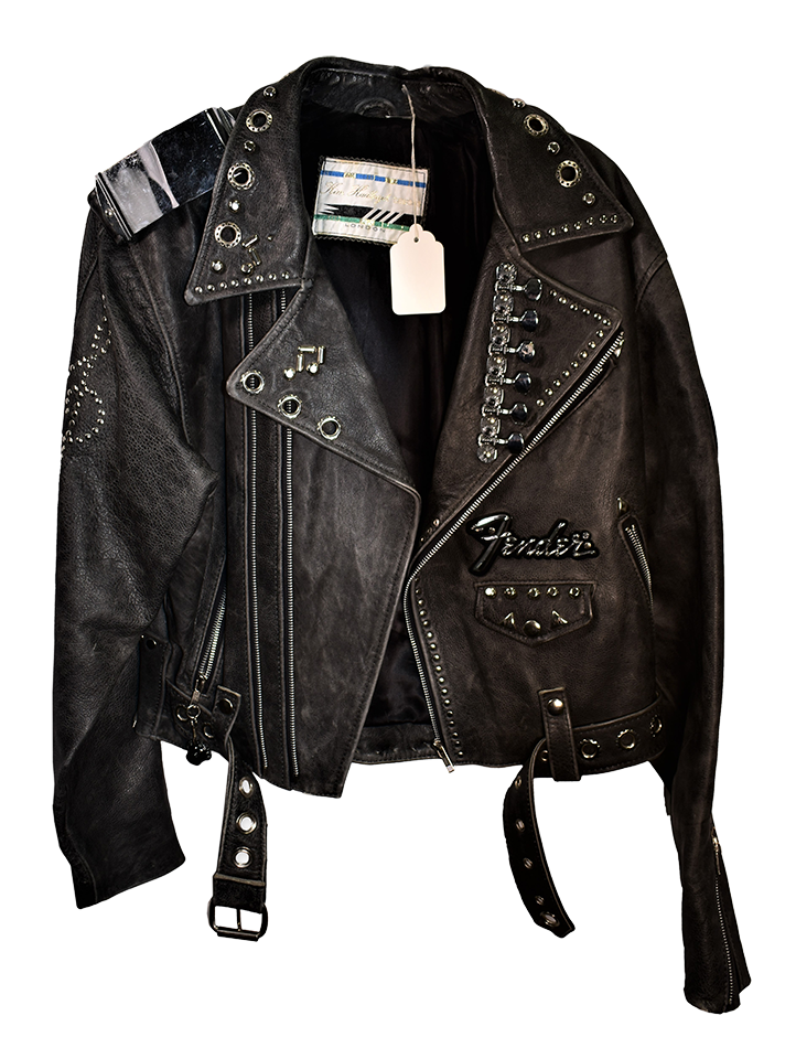 A Joe Elliott stunner, this is a black leather jacket with tuning pegs on lapel, musical note stud designs on collar and sleeve, and metal plates on the shoulder and left bicep. There is a Fender plate above the front pocket, and a Fender "F" on the back written in studs. The tag on the jacket reads "Joe Elliot Kim Hadigle jacket with guitar parts on it". From the collection of Joe Elliott.