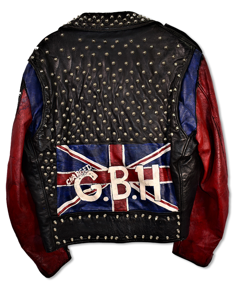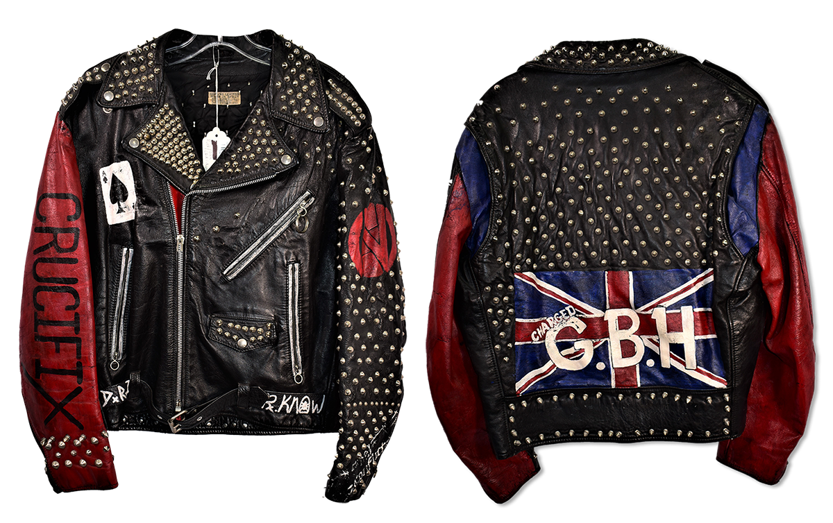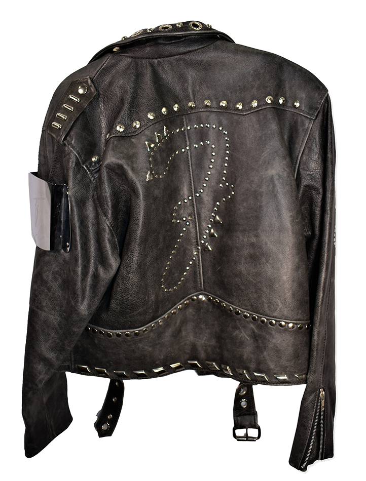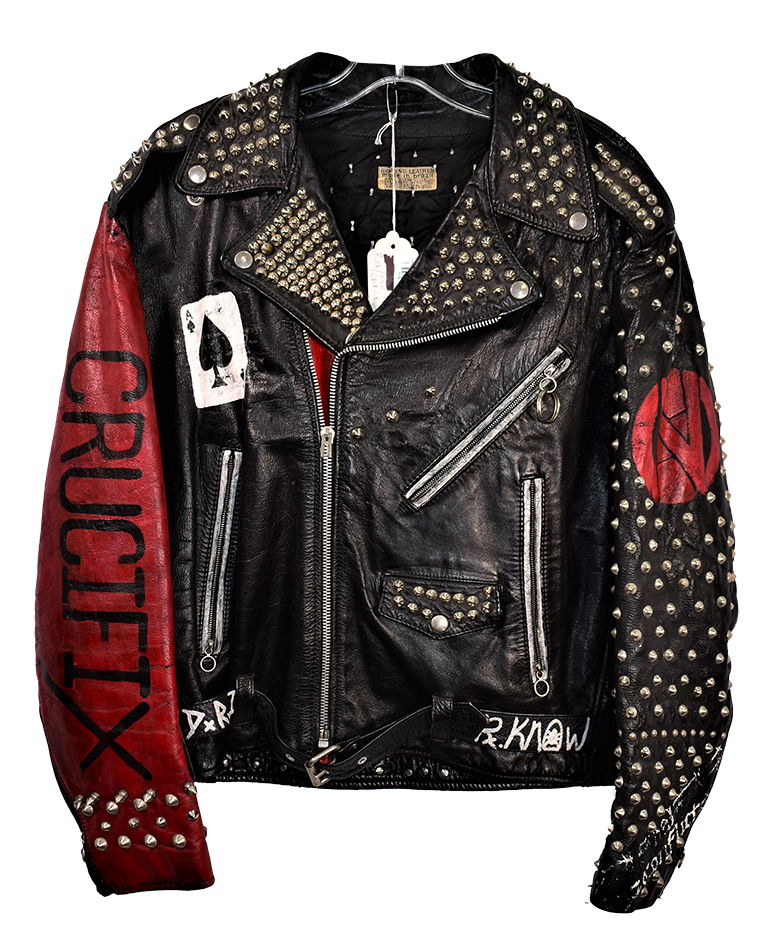 Rocket Video legend! Rick Savage donned this spiked and studded black leather biker jacket for the band's incredible 1988 Rocket video. Fittingly, as Rocket honors some of Del Leppard's biggest musical influences, this punk rock tribute jacket honors some of the greatest punk acts of all time - Conflict, Dr. Know, Mötorhead, Crucifix, and G. B. H - with hand-painted logos over black. Check out the back - it's covered collar to belt with studs. No sitting, only moshing for Sav. From the collection of Rick Savage.