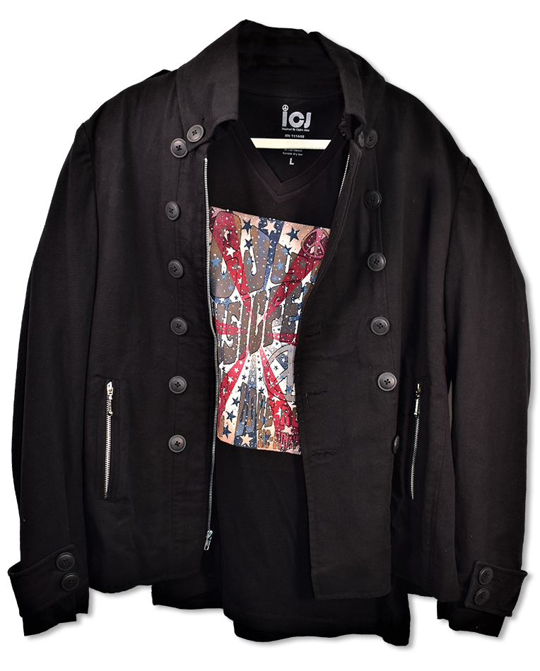 This 2012 MusicFest Peace Love Rock t-shirt is immortalized on the Viva Hysteria DVD, gracing our own Joe Elliott. It's a special "blinged up version" with Swarovski crystals just for Joe, says designer IBCJUK (Inspired by Claire Jane UK). Here this vibrant v-neck is paired with Joe's sharp military-inspired double breasted black jacket. Peace, Love, and Rock forever. From the collection of Joe Elliott.