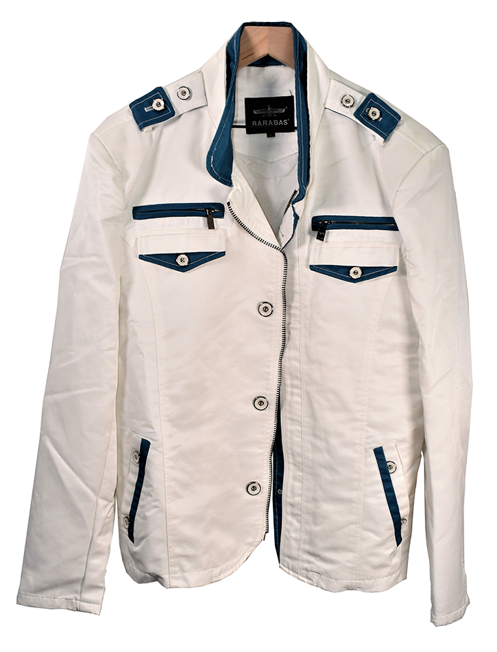 Looks like Joe Elliott wore down the buttons on this snazzy Barabas jacket. He wore this throughout the tour with KISS in 2014. It is a white collared jacket with blue accents & zippers above pockets and in good condition regardless of the wear. From the collection of Joe Elliott.