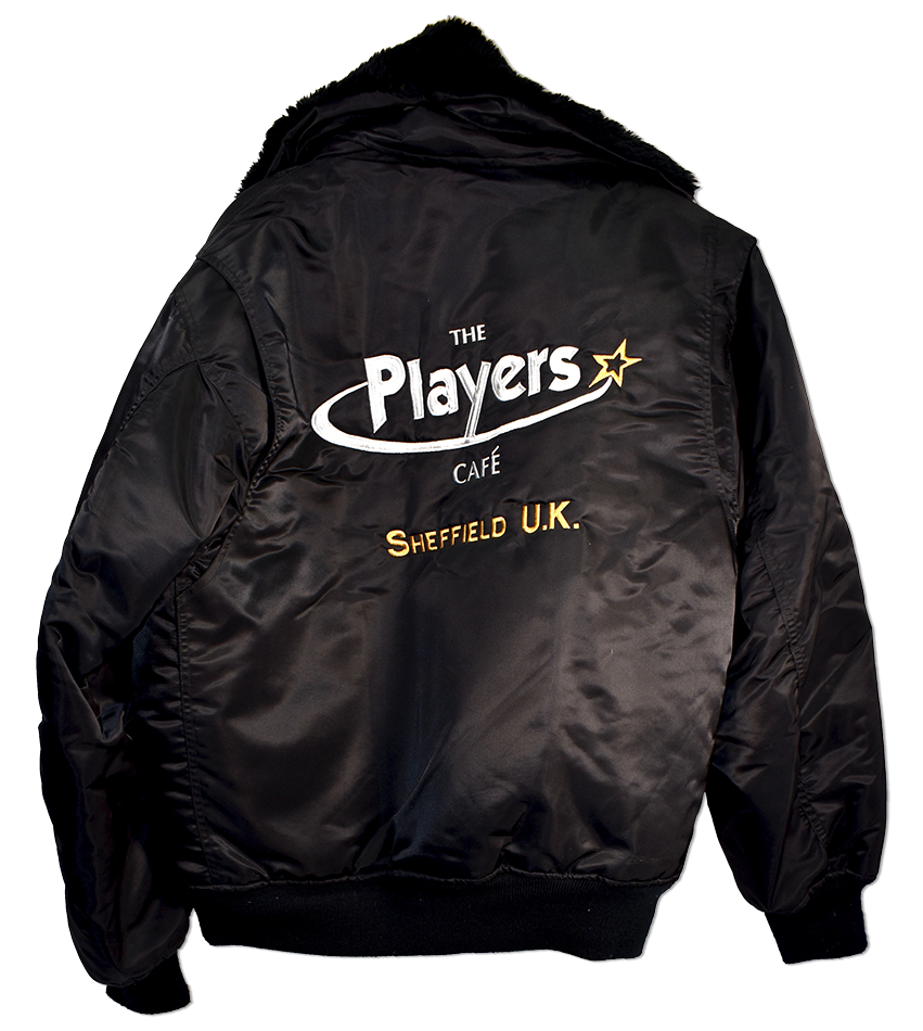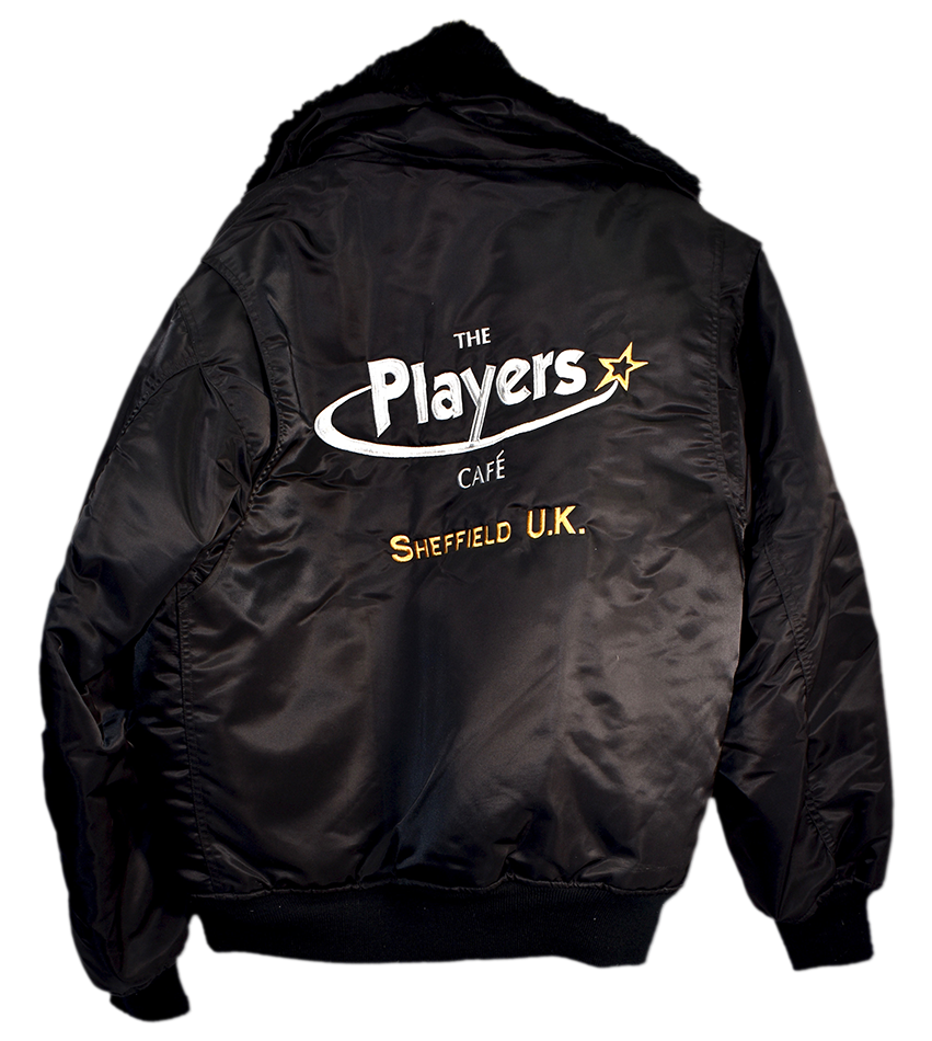 This black bomber jacket with detachable fur collar sure must have kept Joe Elliott warm. It is from Joe and Sav's restaurant in Sheffield. Left side of the chest has "The Players Cafe Sheffield U.K." printed in silver and gold. The back of the jacket has text that reads "The Players Cafe Sheffield U.K." also in silver and gold. From the collection of Joe Elliott.