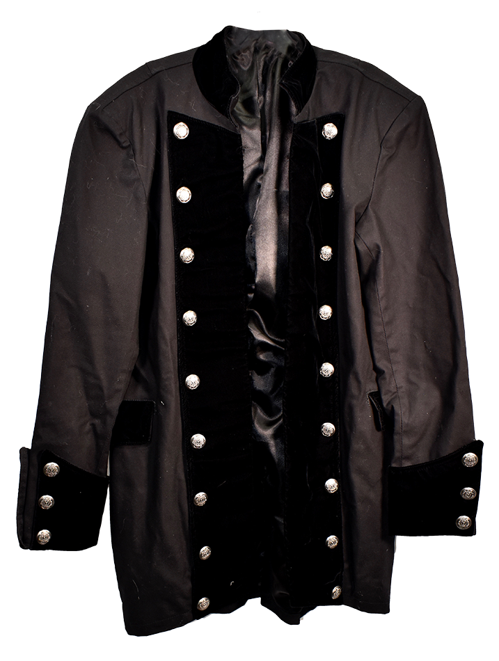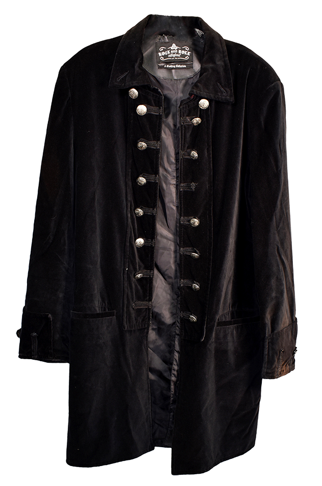 Jacket required indeed! Black velvet, fourteen button, two pocket, long jacket. Made by Rock and Roll Religion. From the collection of Joe Elliott.