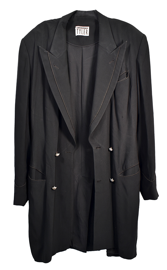 This jacket was worn in the video for Heaven Is @ Ardmore Studios located in Bray County, Wickelow Ireland spring of 1992. Made to impress, this Richard Tyler black double-breasted coat has top lapels, and roped motif on sleeves, pockets, and lapels. The back has a placket. From the collection of Joe Elliott.