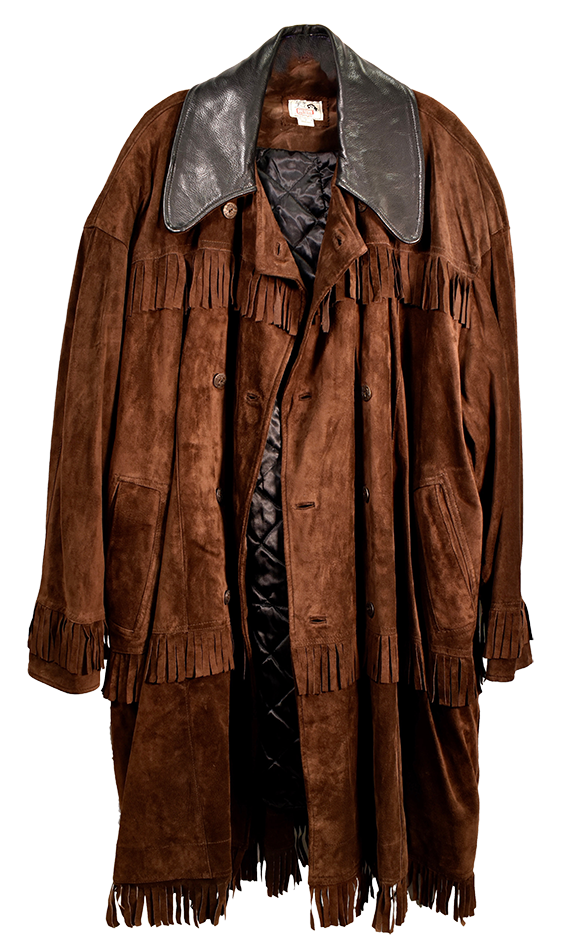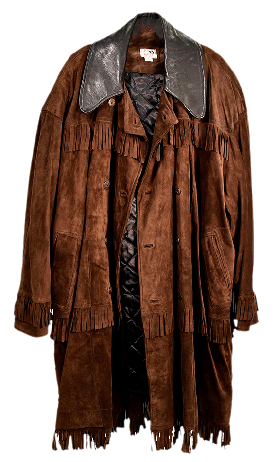 A wicked brown suede fringe overcoat from British fashion label Workers For Freedom featuring a leather collar and quilted lining. The image of a Chinese dragon adorns the buttons on this sweet coat. From the collection of Joe Elliott.