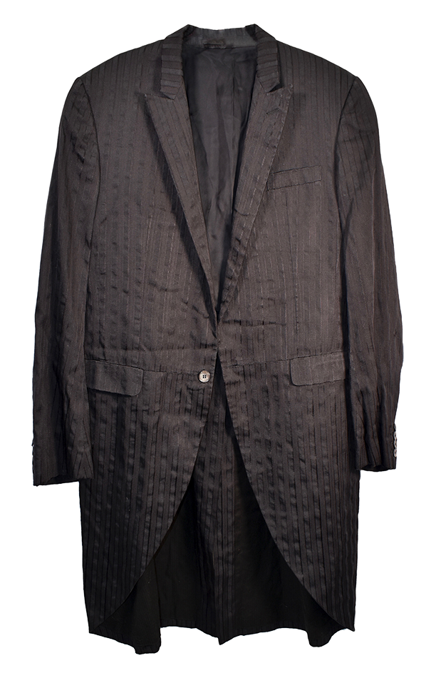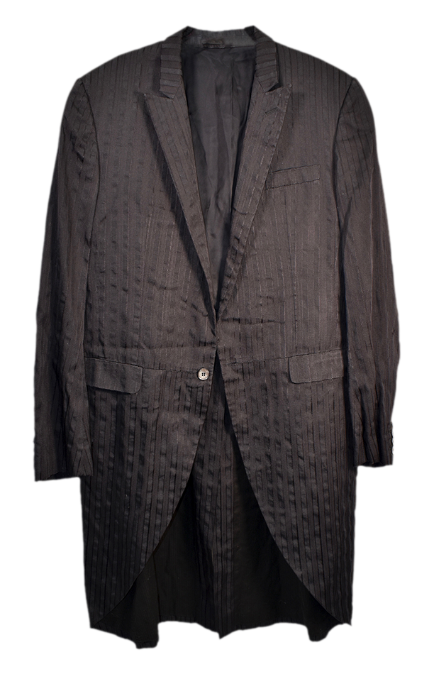Joe Elliott must have looked like the essence of rock in this Alexander McQueen black pin-stripped lapel suit-style overcoat. It has two pockets, one button, and two inside pockets. From the collection of Joe Elliott.