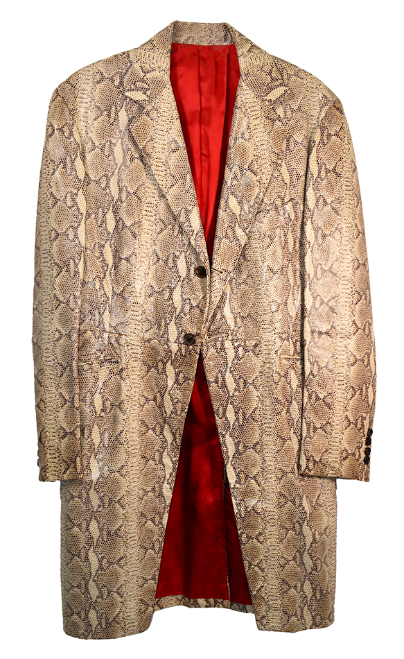 This Tummy Figer beige, snakeskin overcoat rocked out with Joe Elliott. You can see the slightly worn contours of a sleek rock legend's frame in this jacket with two pockets outside, and two pockets inside. From the collection of Joe Elliott.