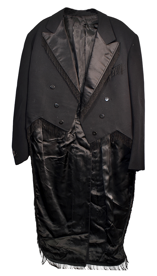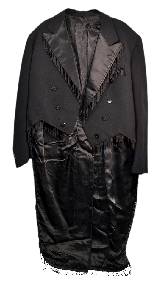 Slick beaded fringe tuxedo jacket with tailcoat and sewn-on cuffs. From the collection of Joe Elliott.