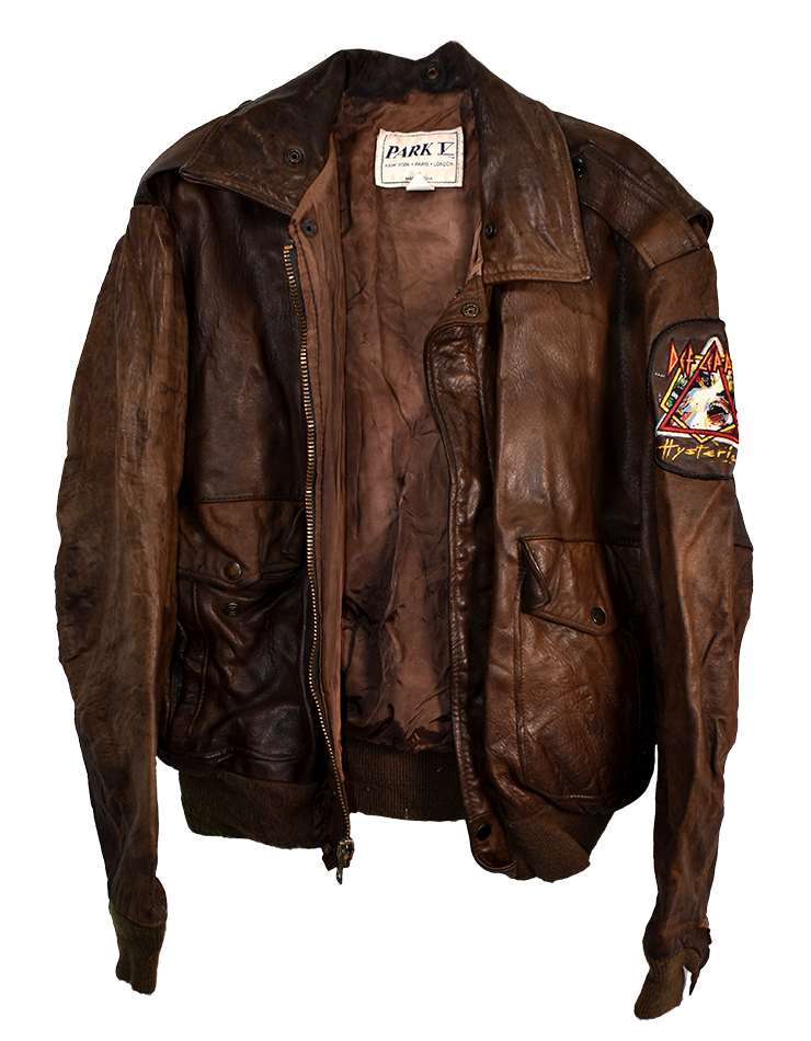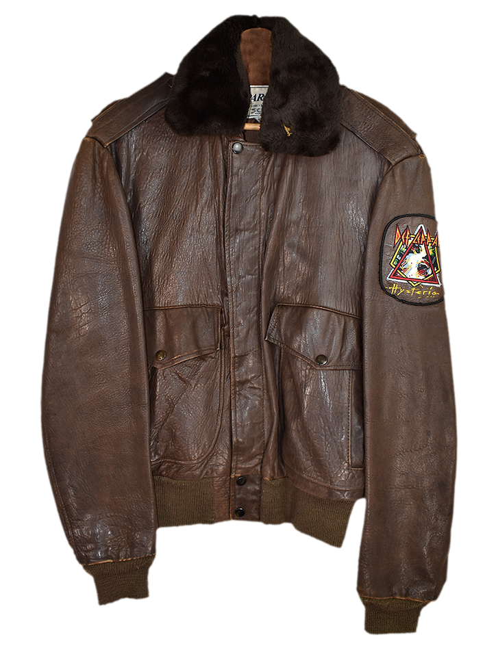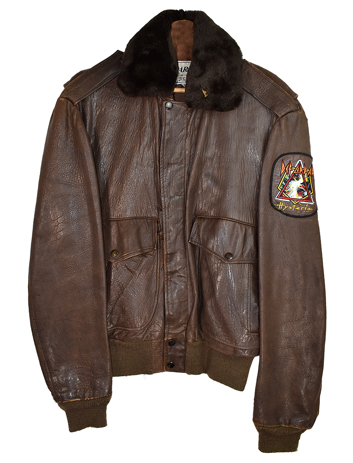 Love is like a bomber, baby come and get it on! Steve Clark's brown leather vintage aviator jacket from the Hysteria tour, and his own personal use. Faux fur collar (with plane pin), snap pockets, and rad Def Leppard Hysteria patch on the sleeve. Knit cuffs and waist show wear. Courtesy of the Lorelei Shellist Private Collection.