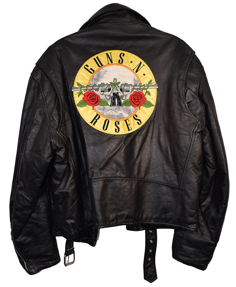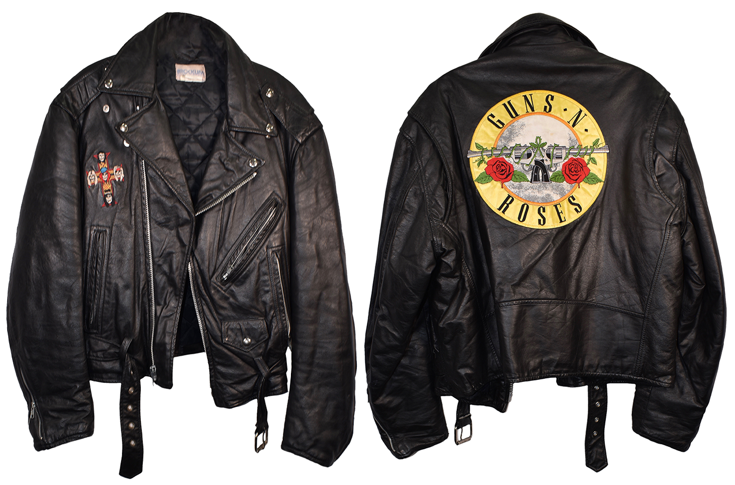 This jacket gives you double the fandom! Not only did this leather jacket belong to Rick Allen, but it is also showcasing the Guns 'N' Roses "Appetite For Destruction" cross patch with the bandmates skulls on the front, and the back of the jacket has the Guns 'N' Roses insignia patch with two guns and two roses. From the collection of Rick Allen.