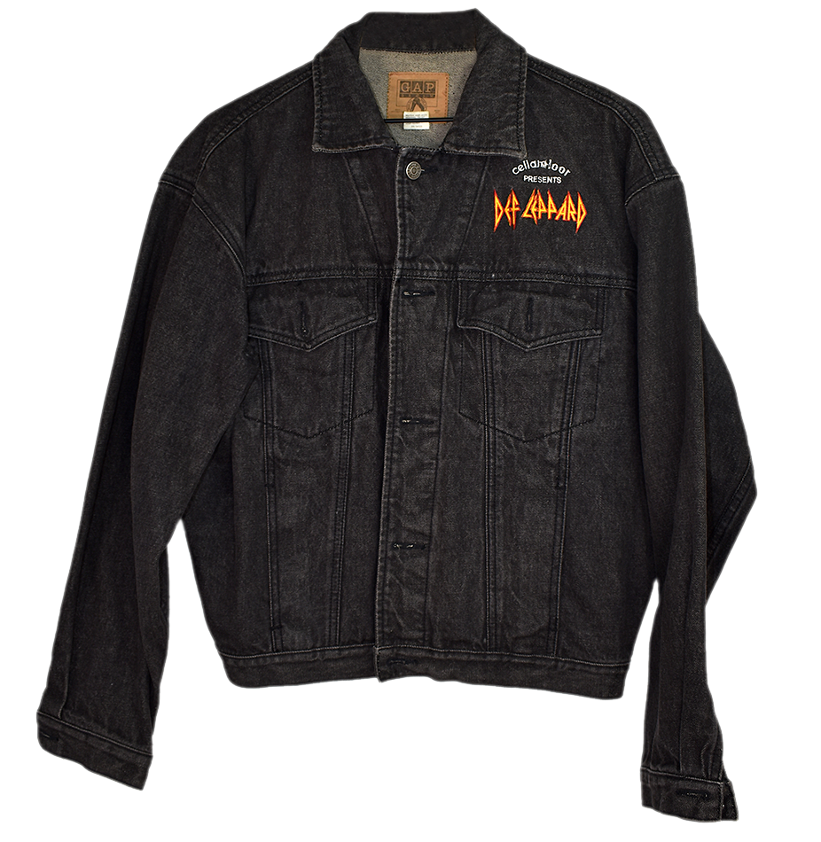 Faded black denim Gap brand jacket from Steve Clark's wardrobe - "Cellar Door presents Def Leppard" embroidered above the breast pocket. Good condition. Courtesy of the Lorelei Shellist Private Collection.