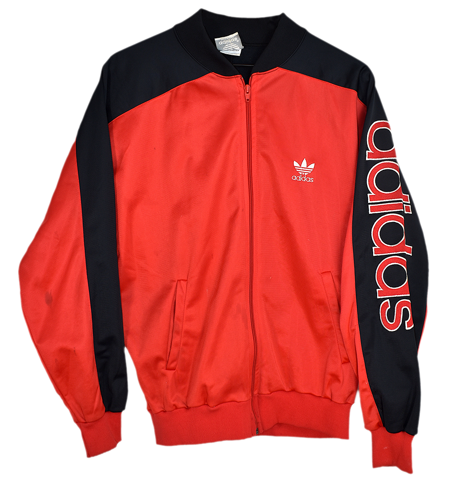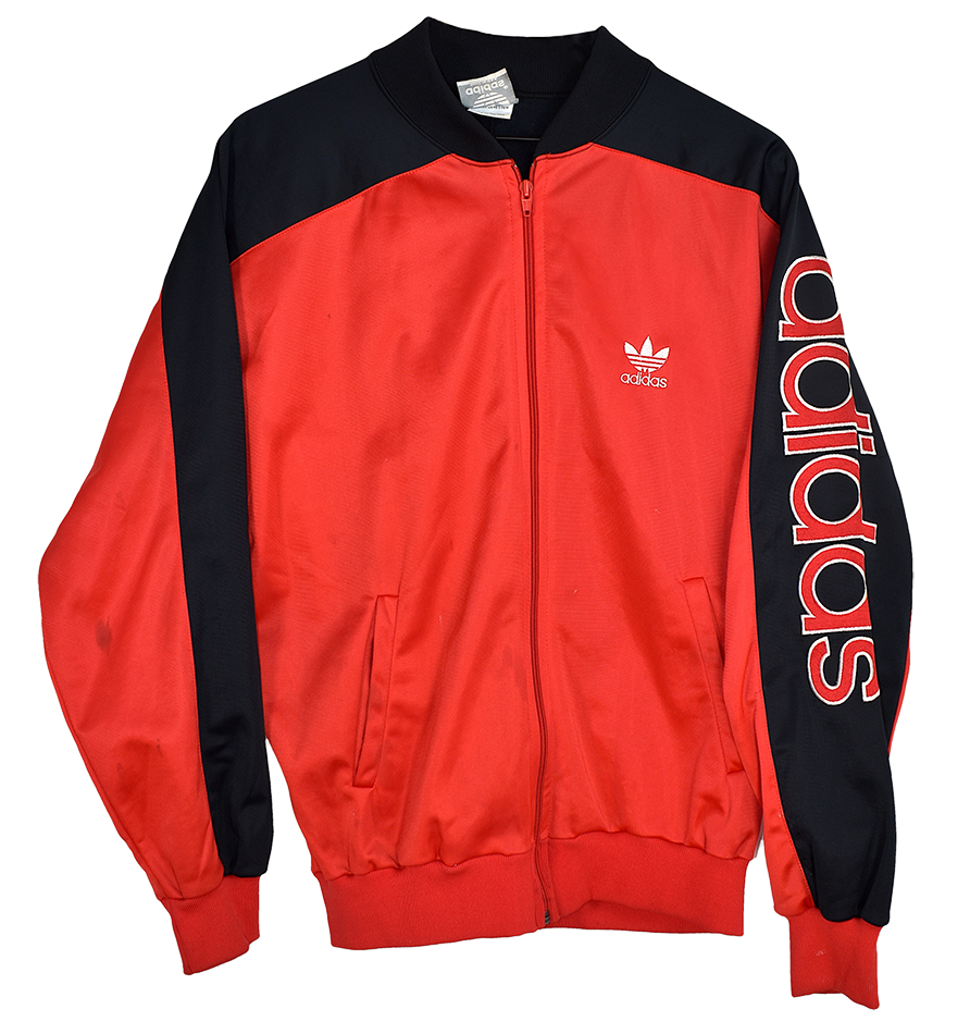 Steve Clark's personal red Adidas brand track jacket with black accents, bold Adidas lettering down one sleeve, and white logo on the breast. Courtesy of the Lorelei Shellist Private Collection.