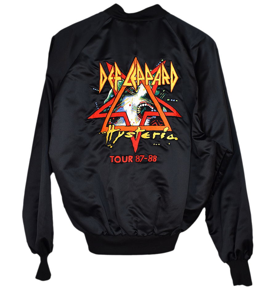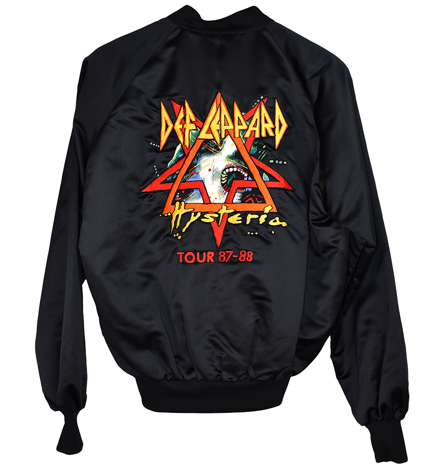 Love is like a bomber baby, c'mon get it on! Steve Clark's personalized black satin bomber jacket from the Hysteria Tour. Andie Airfix's full color Hysteria artwork graces the back, with "TOUR 87-88" embroidered underneath. On the front, sewn in yellow thread, is a perfect cursive "Steve." Good condition. Courtesy of the Lorelei Shellist Private Collection.