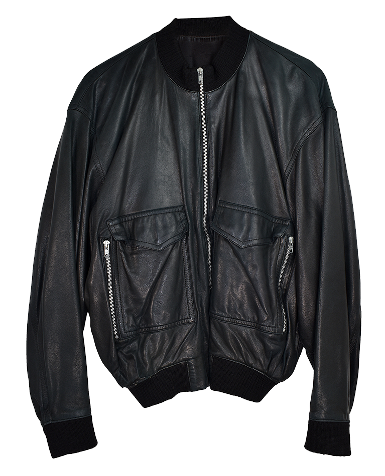 Worn by Steve Clark, this black leather jacket zips up the front, and has large patch pockets as well as zipper side pockets. Courtesy of the Lorelei Shellist Private Collection.