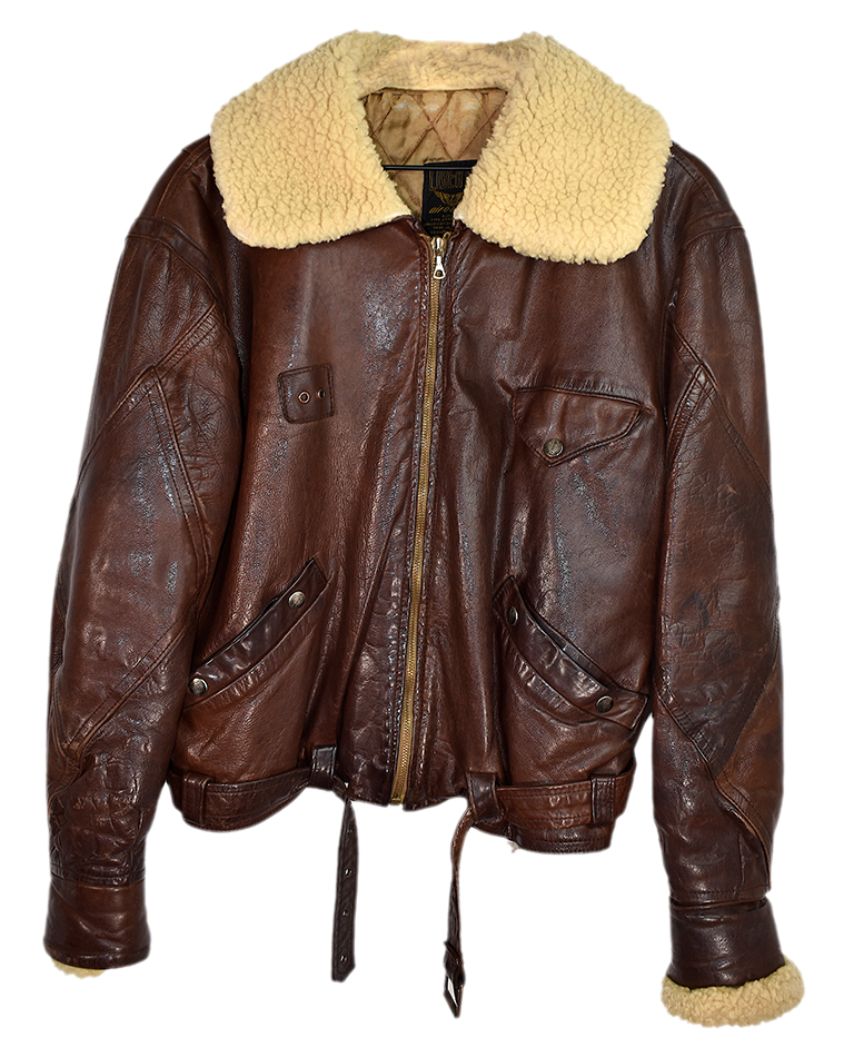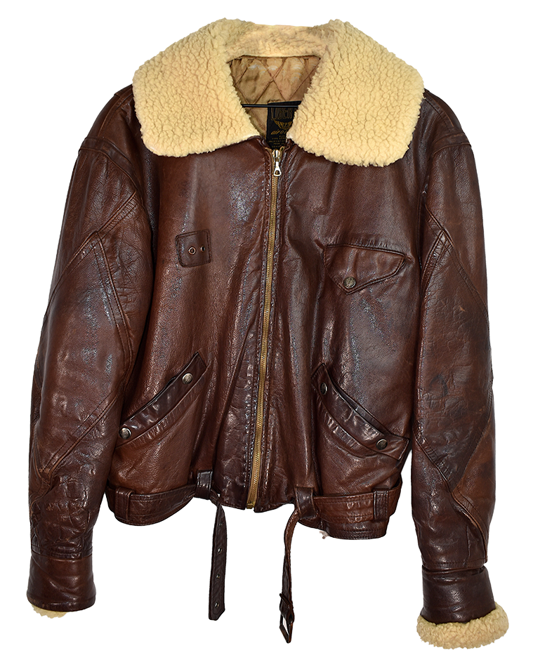 This classic military-style brown leather flight jacket with sheepskin collar, knit cuffs and waistband, and quilted lining belonged to Steve Clark. Steve wore this Liberto bomber both in press photos and in his day-to-day. Frayed at cuffs, waistband, and lining with scuffs in the leather from wear. Courtesy of the Lorelei Shellist Private Collection.