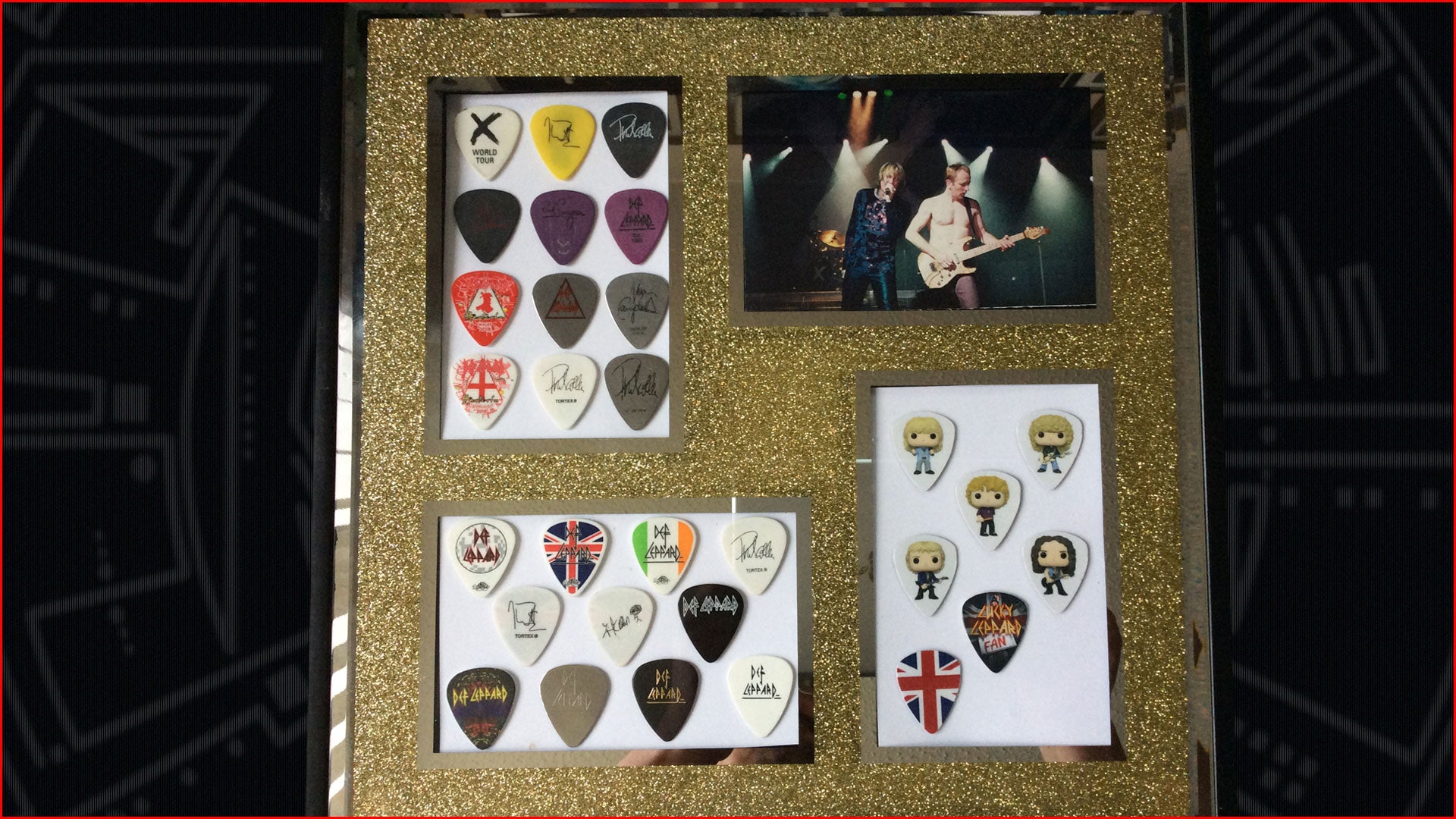 Upper Left Box, Row 3 & 4 - Six plectrums all given to me personally by band members and Ted Bible on the Hysteria & More UK/Eire Tour 2018. Being a proud Welshman, I especially love Sav’s Wales plectrum!