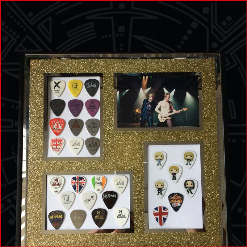 Lower Left Box, Row 1 & 2 – My six plectrums that were part of the Mystery Box (Limited to 250) for purchase at the Vault store during the launch in January 2020.Bottom Right Box– A huge thank you to fellow Vault member David Allen for a set of these scarce promotional plectrums supporting his brilliant debut book A Lucky Leppard Fan.