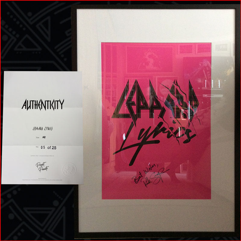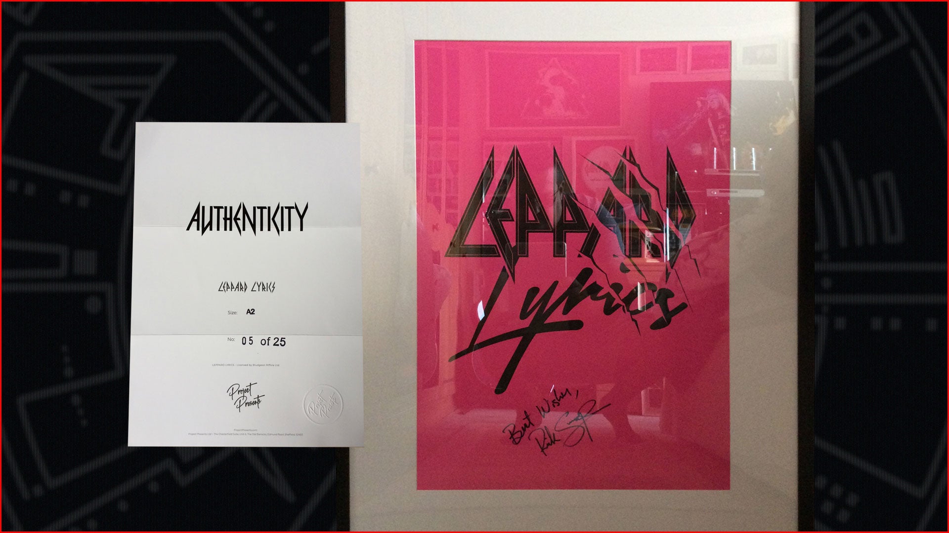 The latest addition to my collection is very recent and is certainly a “gallery piece” in its own right. It has proved to be a real conversation starter and has generated a lot of excitement amongst Rick Savage devotees on social media channels for sure! I am absolutely thrilled to be the owner of the Project Presents, pink Leppard Lyrics A2 poster signed by Sav. I have been given #05/25 worldwide and I am now part of an exclusive owners club of this beauty!