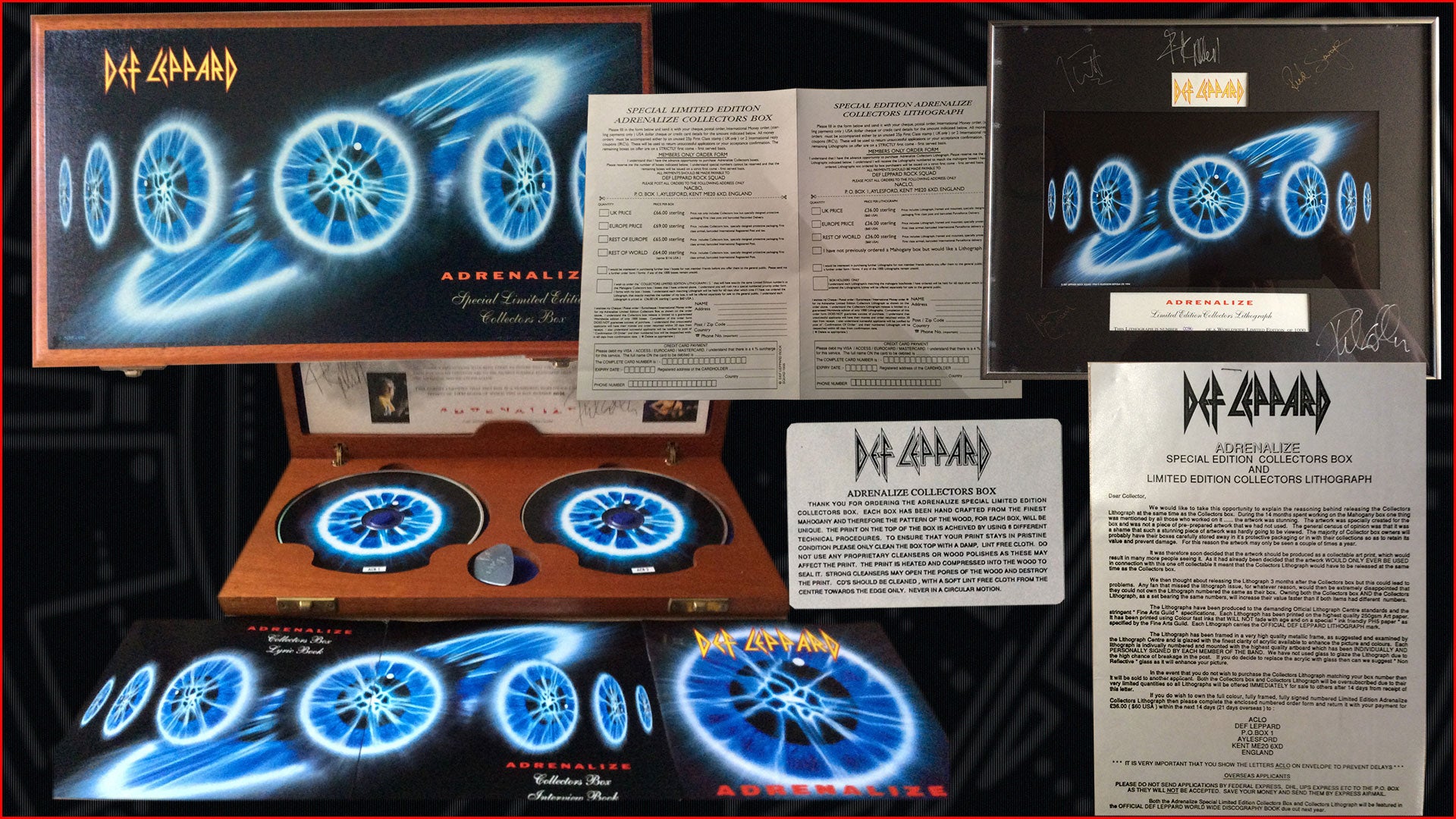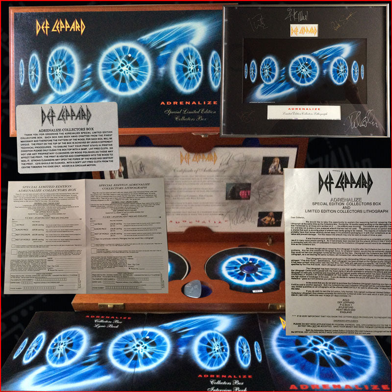 The lithograph arrived first with signed autographs in gold and silver, No. 0096/1000. These were the first autographs I have had from Def Leppard and remain a very special part of my entire collection. My box set arrived later and the quality is exceptional! It is a real work of art, with the mahogany, velvet inlay and laser-jet artwork on the front of the box. The metal plectrum was a fine addition. When you take out the Adrenalize CD booklet and interview booklet, the signed and numbered certificate of authenticity is revealed. This is also 0096/1000 and I still have the original cardboard box and packaging for the box set. In the last twenty-seven years, I have only ever seen one box set come up for auction and it was sold for an expensive figure indeed. If you are lucky to own one, hold onto it. If you are ever blessed enough to see one for sale and you are able to do so, go for it. It really will be a highlight of your collection, as it is in mine!