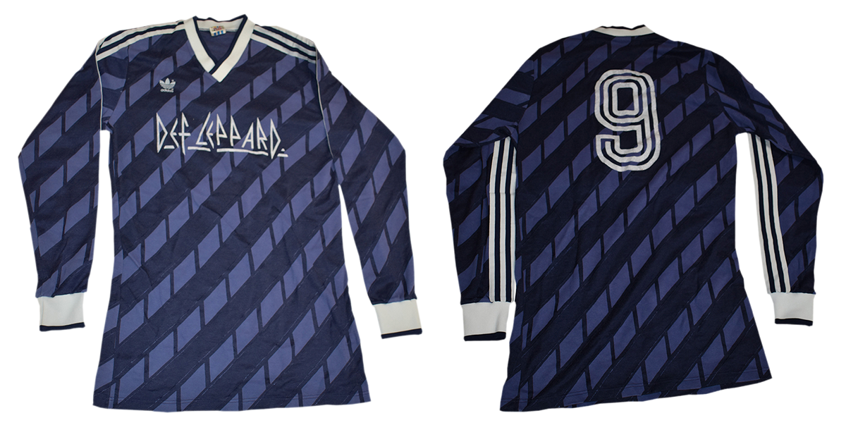 Made in 1987/88 this blue striped Adidas football jersey with white v-neck and cuffs. White Def Leppard logo adorns the chest, with Joe's number 9 printed on the back. A testament to the band's love of soccer that you can wear. From the collection of Def Leppard.