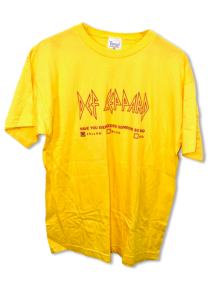 The yellow version of a series of three colorful shirts marking the release of "Have You Ever Needed Someone So Bad" from Adrenalize, 1992. The dreamy rock ballad sold more physical copies in the States than any other Def Leppard single, and so needed more than one color shirt to celebrate. From the collection of Def Leppard.