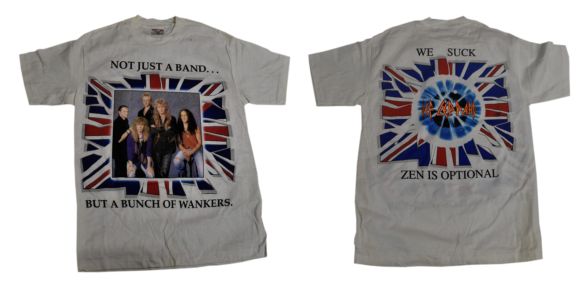 We only hurt the ones we love. This shirt was created as an inside joke between the band and their team coined by the crew. This tough love tee features a full color picture of Rick Allen, Phil Collen, Joe Elliott, Vivian Campbell, and Rick Savage, and "Not Just a Band...But a Bunch of Wankers" proudly printed on the front, over a shattered Union Jack. On the back, we have the Adrenalize logo over the same broken Jack, with the words, "We Suck, Zen is Optional." From the collection of Def Leppard.