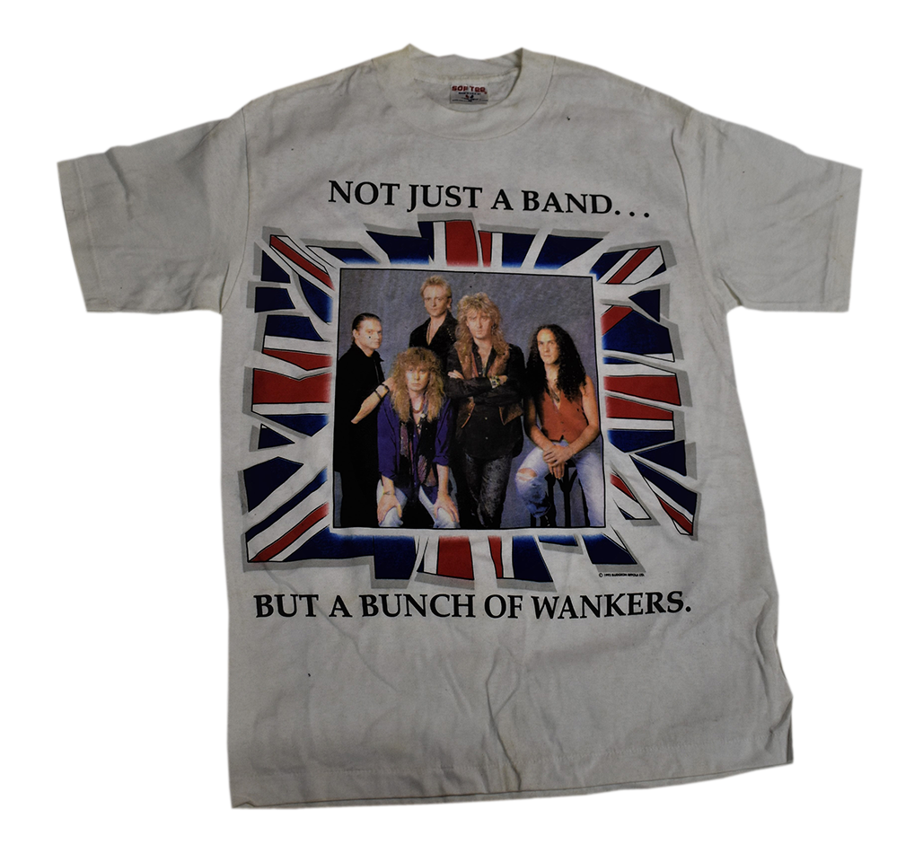 This rarest of rare, inner-circle only, Andie Airfix designed grey t-shirt was a bit of f-f-fooling from the band and their manager in early 1984. From the collection of Def Leppard.