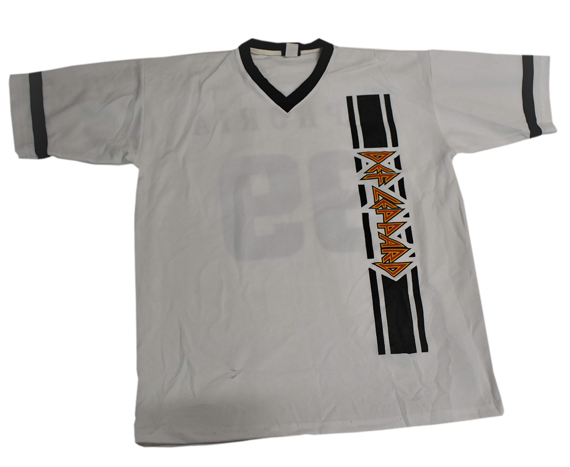 White short-sleeved v-neck sport jersey with red Def Leppard logo on a black stripe down the front, and Euphoria 99 printed on the back. Euphoria was the 7th studio release from the band, and featured the number one hit "Promises." From the collection of Def Leppard.