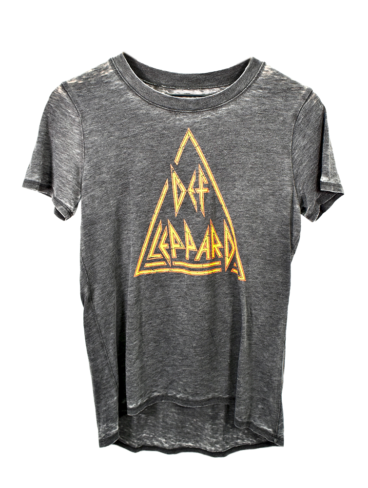 Grey short-sleeved t-shirt with distressed gold and red Def Leppard logo inside of a triangle emblazoned on the front. From the collection of Def Leppard.