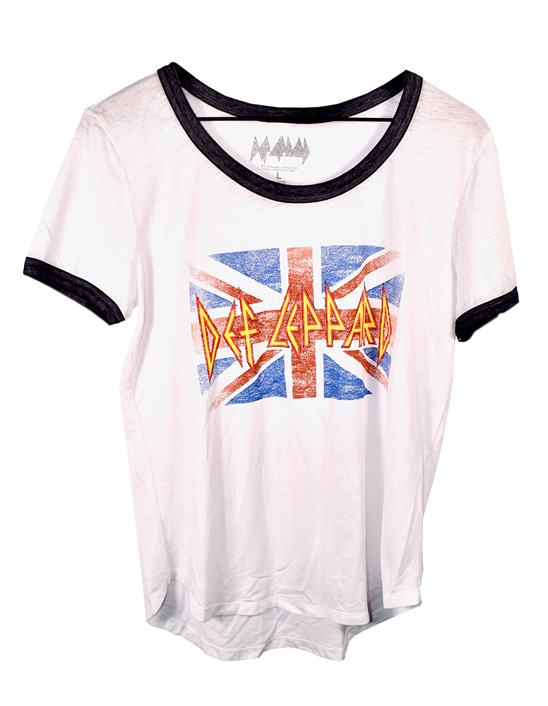 White t-shirt with black rings, a distressed Union Jack, and the classic red and yellow Def Leppard logo. From the collection of Def Leppard.