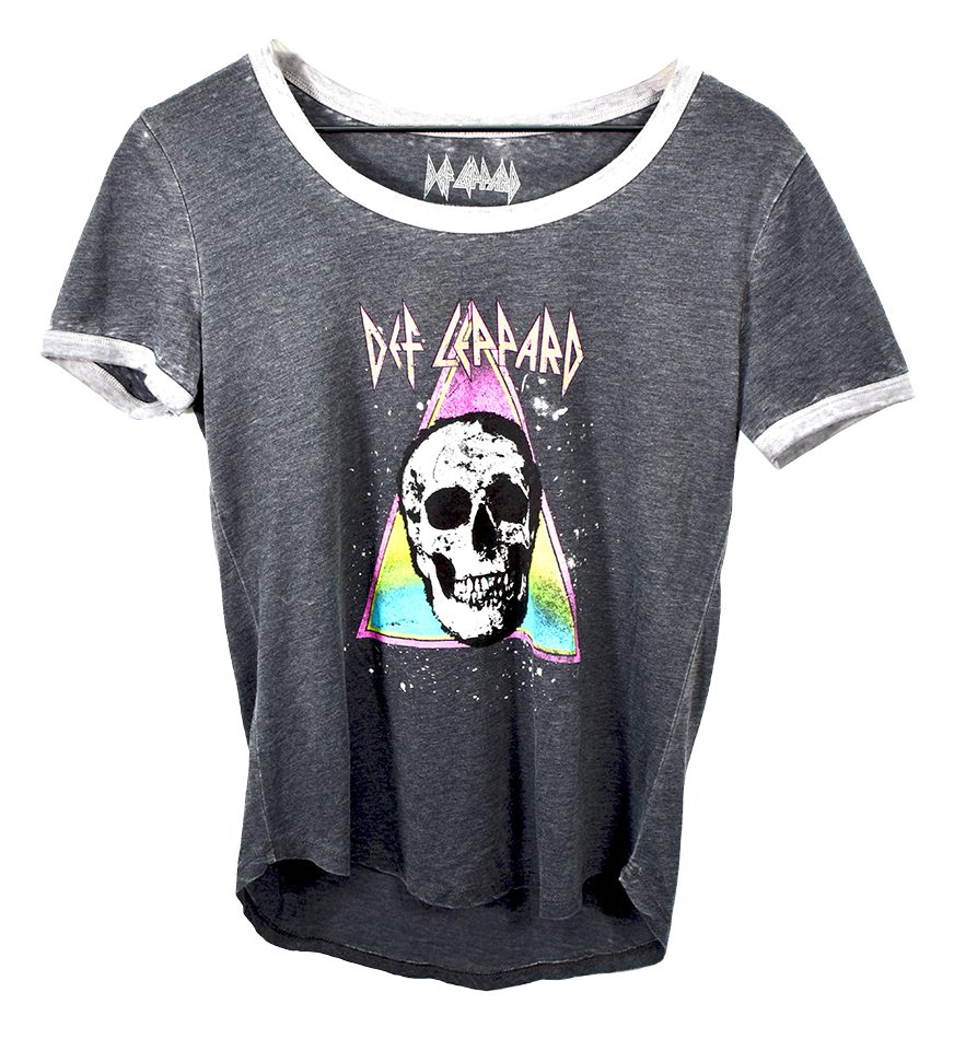 White-ringed gray distressed t-shirt with skull artwork over a pink, yellow, green, and blue triangle, and a pink and yellow Def Leppard logo. From the collection of Def Leppard.