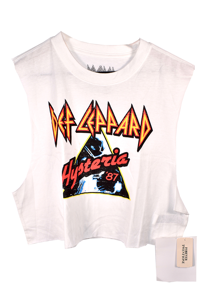 An homage to the good ole days of crop tops-so-high, and sleeves-so-cut, this white sleeveless half-top tee brandishes full-color Hysteria art and a classic red and yellow Def Leppard logo. From the collection of Def Leppard.