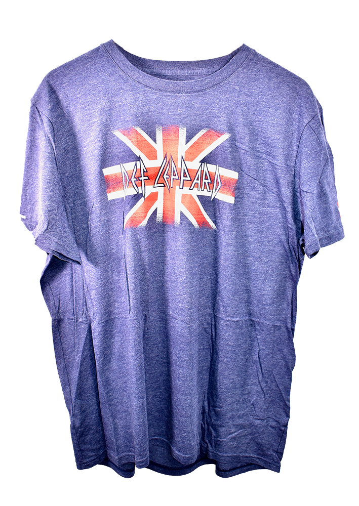 Blue short-sleeved t-shirt with Union Jack and white and black Def Leppard logo. From the collection of Def Leppard.