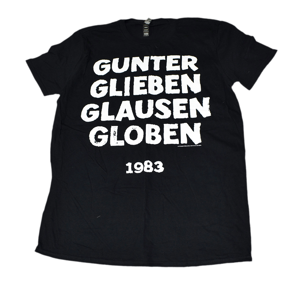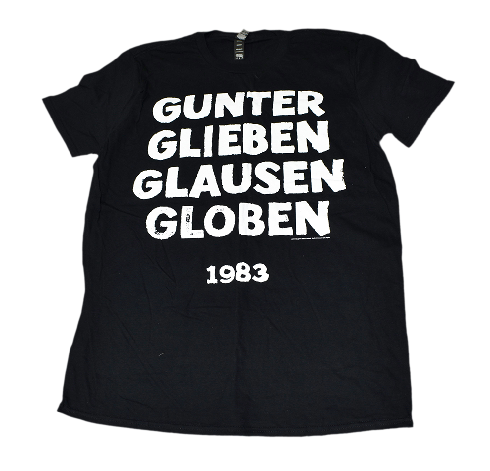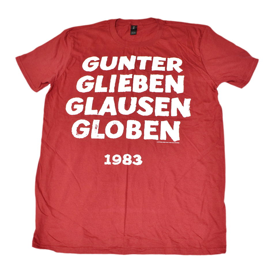 This 1983 Gunter, Glieben, Glausen, Globen t-shirt honors the legendary beginning of the Def Leppard arena anthem Rock of Ages. Mutt Lange's unusual way of counting off became immortalized in the song, and Joe Elliott tells us more about the song's beginning and beginnings. Joe: "So Rock of Ages was 1982, Pyromania, we were locked in Battery Studios in London, for the whole of 1982. Rock of Ages was a Steve Clark riff I believe, but the original demo, which we have the cassettes of, there's a snippet of it, and it's like half the speed of the song as we know it. And it's the intro part of the song. And then because it was, we were starting to become aware of new studio technology which would go completely haywire, just go over the top three years later when we were doing Hysteria with synthesizers and Synclaviers and Fairlights were starting to appear into our lives in the studio and Mutt was a huge, uh, kind of, fan of new gear. And so we were. You know, we'd read all the stories about the Beatles splicing tape, turning it backwards, and the seagull sounds on things like Tomorrow Never Knows, you can never get it back 'cause it was a one off, and all these kind of mad things. And we'd been, like, going, "Ah, it'd be great if we could be the hard rock version of the Beatles and do this all this backwards stuff." And basically we could. But we had to cut tape, paste, snip, turn it upside down, but it was starting to change. And, and one of the things we had was a sequencer. So that the bass part, as well as Sav playing bass we had this keyboard synth which was completely in time, which meant, meant for the first time in our careers, although it was only our third album, we were having to play to click tracks because you, you couldn't deviate off the sound. It was, basically it was exactly the same thing as what Giorgio Moroder did with Donna Summers I Feel Love, which he had that (singing), which is great for disco. And we had (singing) we had (singing), so similar but different. We were playing around with it and we knew that it was very anthemic, the weird thing was that in Mutt's head, he'd got this song mapped out but we hadn't. So, it was me gonna be singing over this synth, bass, and the drums. And then the guitars were gonna be these stabby things in between certain phrases. And then big chorus guitars. But we hadn't got the lyrics written yet. So, we were just counting out 16s and then he'd shout out, "Bridge!" And they would play these bits. And it was crazy. That's why we ended up with the "gunter glieben" at the front because he was having to put markers on tape where he says, "This is - the vocals are gonna last this long and then there's gonna be a guitar change here so I'm gonna give you a four count." And he would record a four count onto tape. So every time we went past, we'd hear it. While it just got boring after a long time. So he changed a lot of these one, two, three, fours into just stupid stuff like "chapati papadum." So the one of them was all Indian food. And then there was "gunter glieben glausen globen," which is just nothing. It’s not German for "running through the forest silently" as has been suggested to us numerous times. So, we worked on this song until we got some lyrics, and then once I got the lyrics to the verses, we were off and running. So we had the, "Rise up gather round, rock this place to the ground. So this is going to be a very anthemic song from the point of view of me, on stage, microphone, looking at the crowd. That's what this was. It was an anthemic arena song." From the collection of Def Leppard.