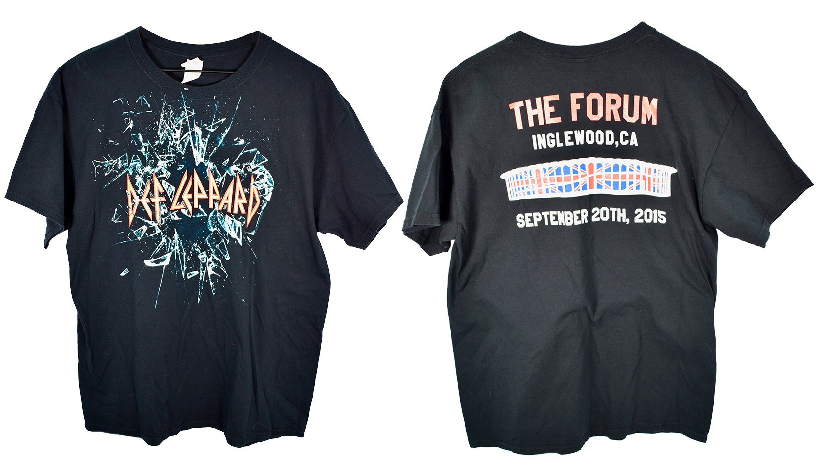 Def Leppard shattered glass t-shirt! Features an image of The Forum covered in the Union Jack on the back, and "The Forum Inglewood, CA September 20th, 2015” written above. An ultra-cool momento from an incredible show! From the collection of Def Leppard.