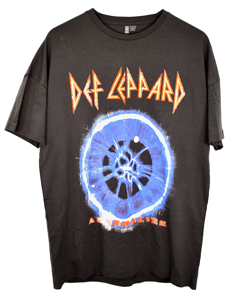 Black short-sleeved t-shirt with Adrenalize cover art and classic red and yellow Def Leppard logo. From the collection of Def Leppard.