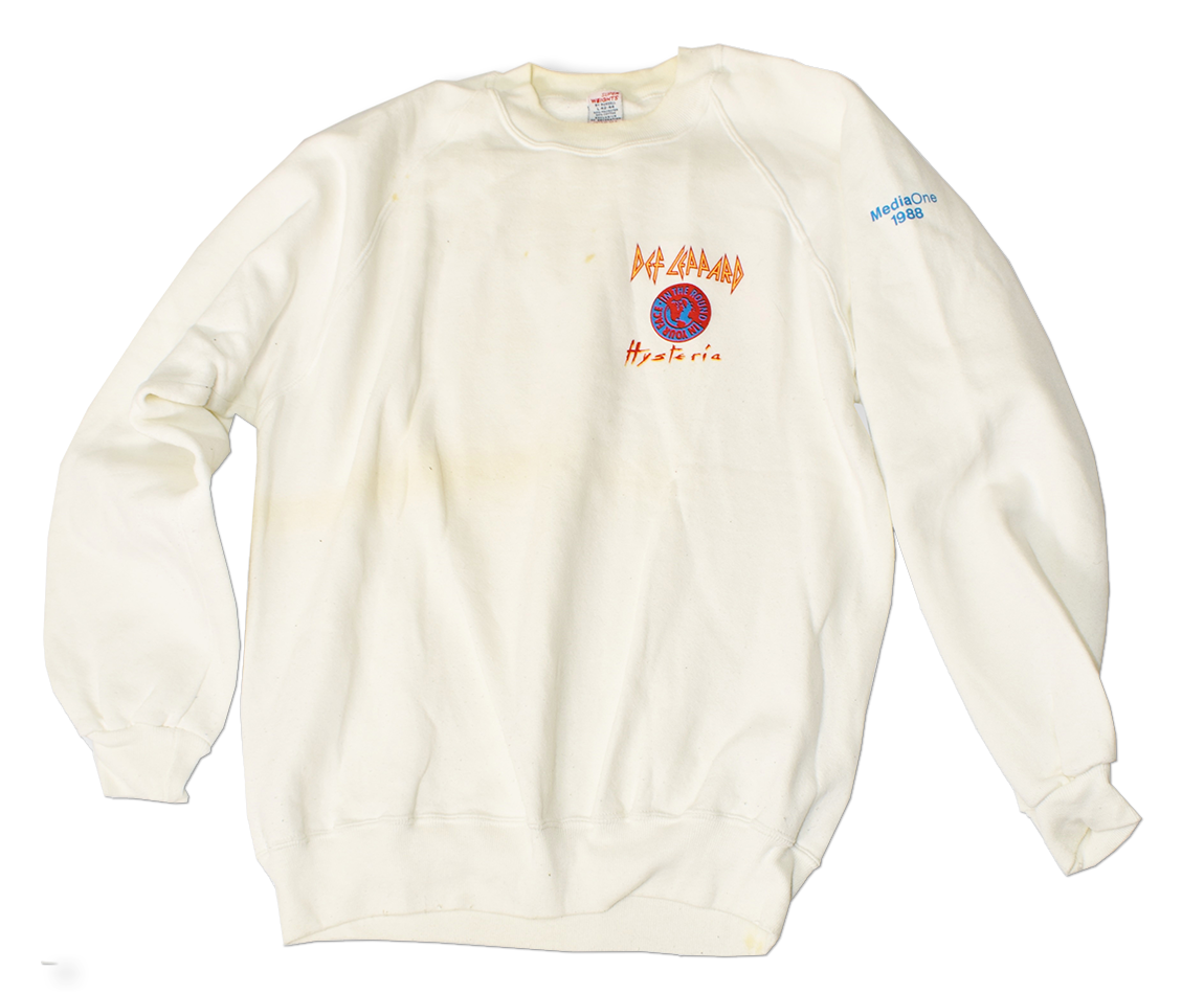 A white crewneck sweatshirt with classic Def Leppard and Hysteria logos that sandwich the logo for "IN THE ROUND / IN YOUR FACE" on the breast. "MediaOne 1988" is printed on the sleeve. The "In the Round, In Your Face" video was released in 1988, and contains a full Def Leppard performance at the McNichols Sports Arena in Denver, Colorado and additional footage from shows at The Omni in Atlanta, Georgia - all compiled from footage shot during the US Hysteria Tour. The accompanying sweatshirt was also evidently pretty comfortable, as it possesses signs of wear, including stains on the front. That's what sweatshirts are made for. From the collection of Def Leppard.